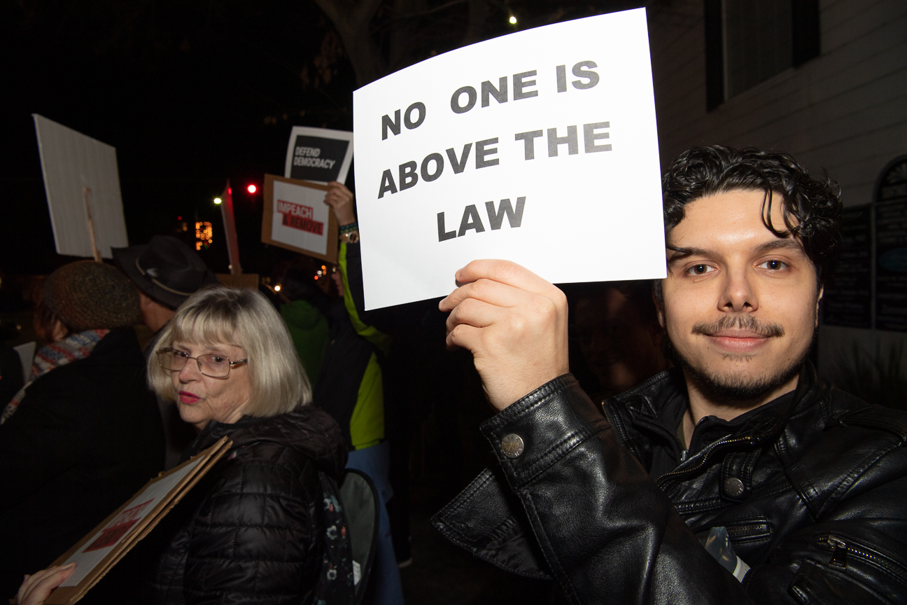 The Fresno area protest was held at the office of Rep. Devin Nunes (R–Tulare) on the corner of Clovis Avenue and 3rd Street in Clovis. Around 350 demonstrators turned out, some carrying the slogan on signs reading “Nobody is above the law!” They lined up in front of the building where Nunes has his office and on two other corners of the intersection. A fourth corner held a counter-demonstration of less than two dozen Trump supporters. Despite their being few in number, the counter-demonstrators got “equal time” on local TV.
