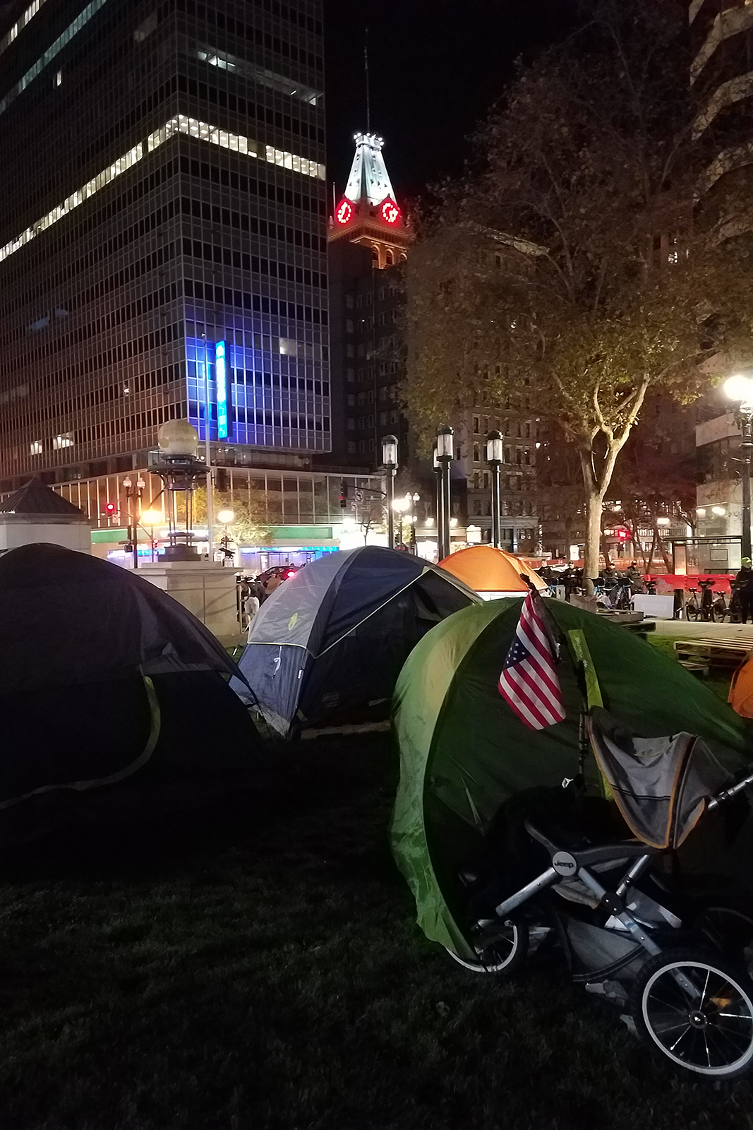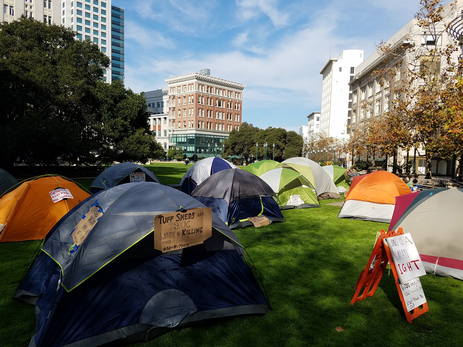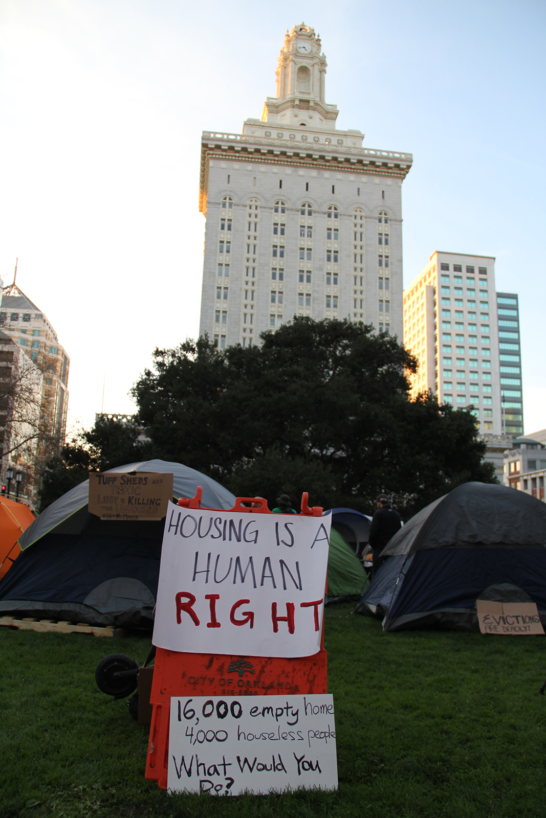 [Photo: A hopeful moment as the Housing Justice Village took shape in Oscar Grant Plaza]