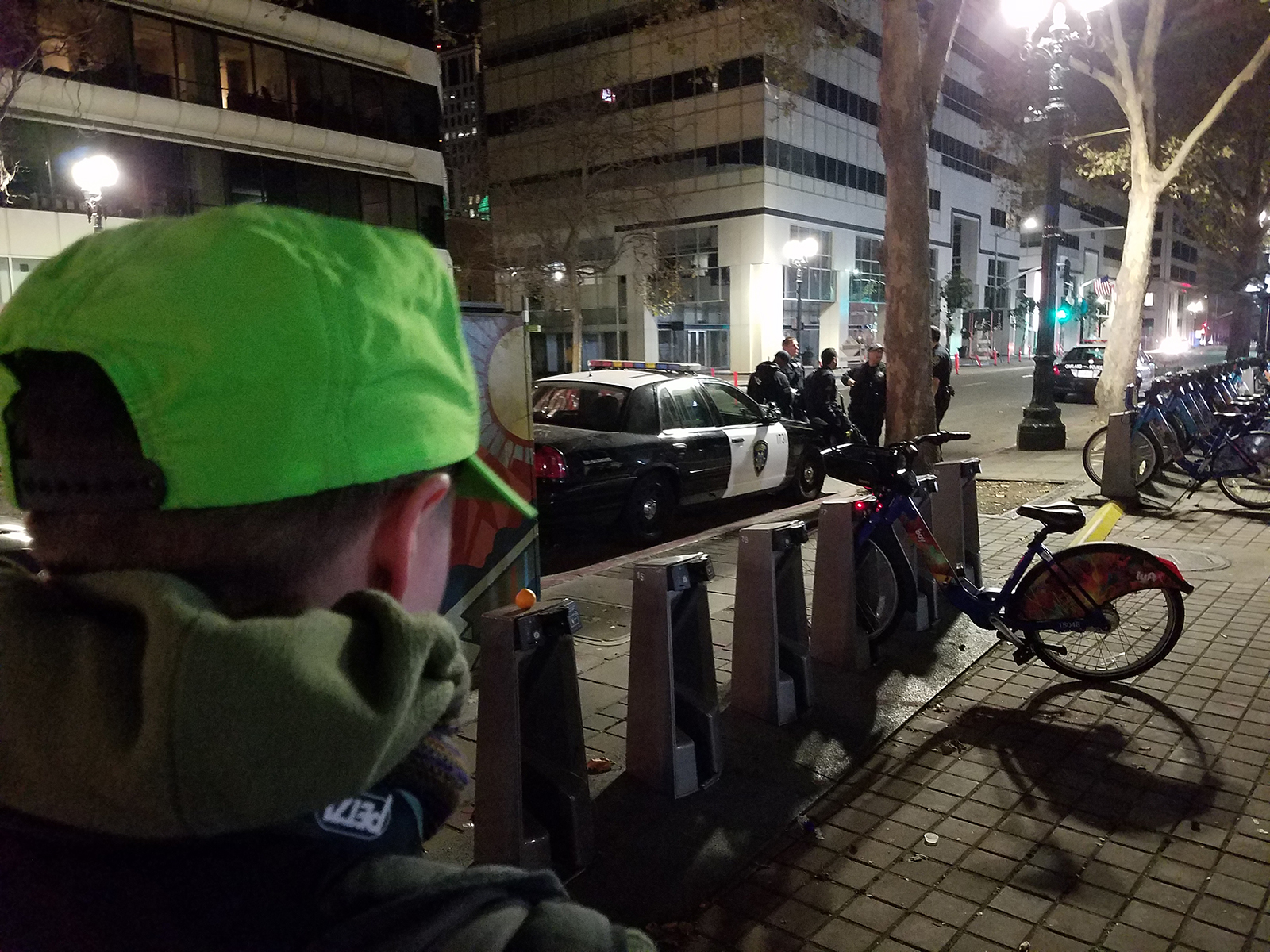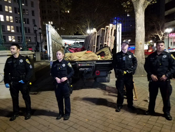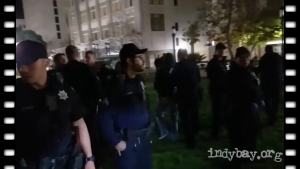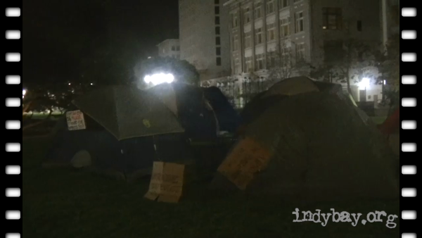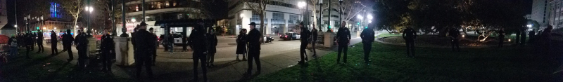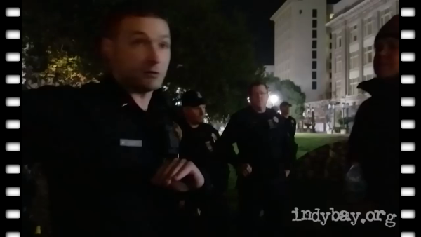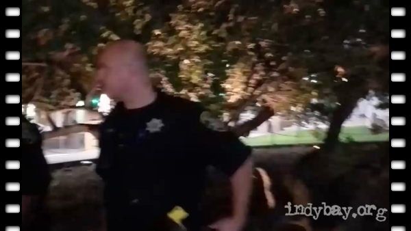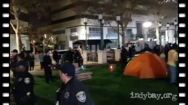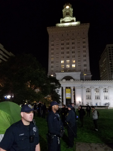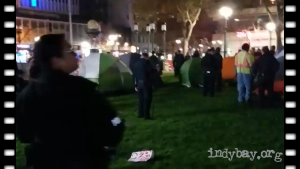Oakland police arrived en force shortly after 11:30pm on November 24, ready to make arrests. It was clearly planned out ahead of time. Within twenty minutes of corporate TV news camera crews wrapping up their live reports and leaving the scene, thereby meaning an assault by the city and mass arrests could take place without ending up on the television news broadcasts, convoys of police vehicles simultaneously rolled up on the 14th Street and San Pablo ends of Frank Ogawa plaza.