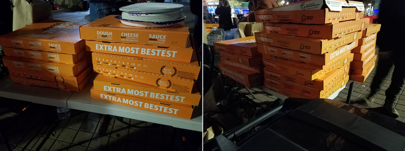 Once word was online about the protest in the plaza, donated food and supplies began to roll in. An informational canopy tent was set up on the pavement, followed by a food tent. Word began to spread on the street, too, and an increasing number of unhoused folks from the area came through to check out what was happening. Food donations continued to arrive throughout the day, and disappeared as fast as they came in.
