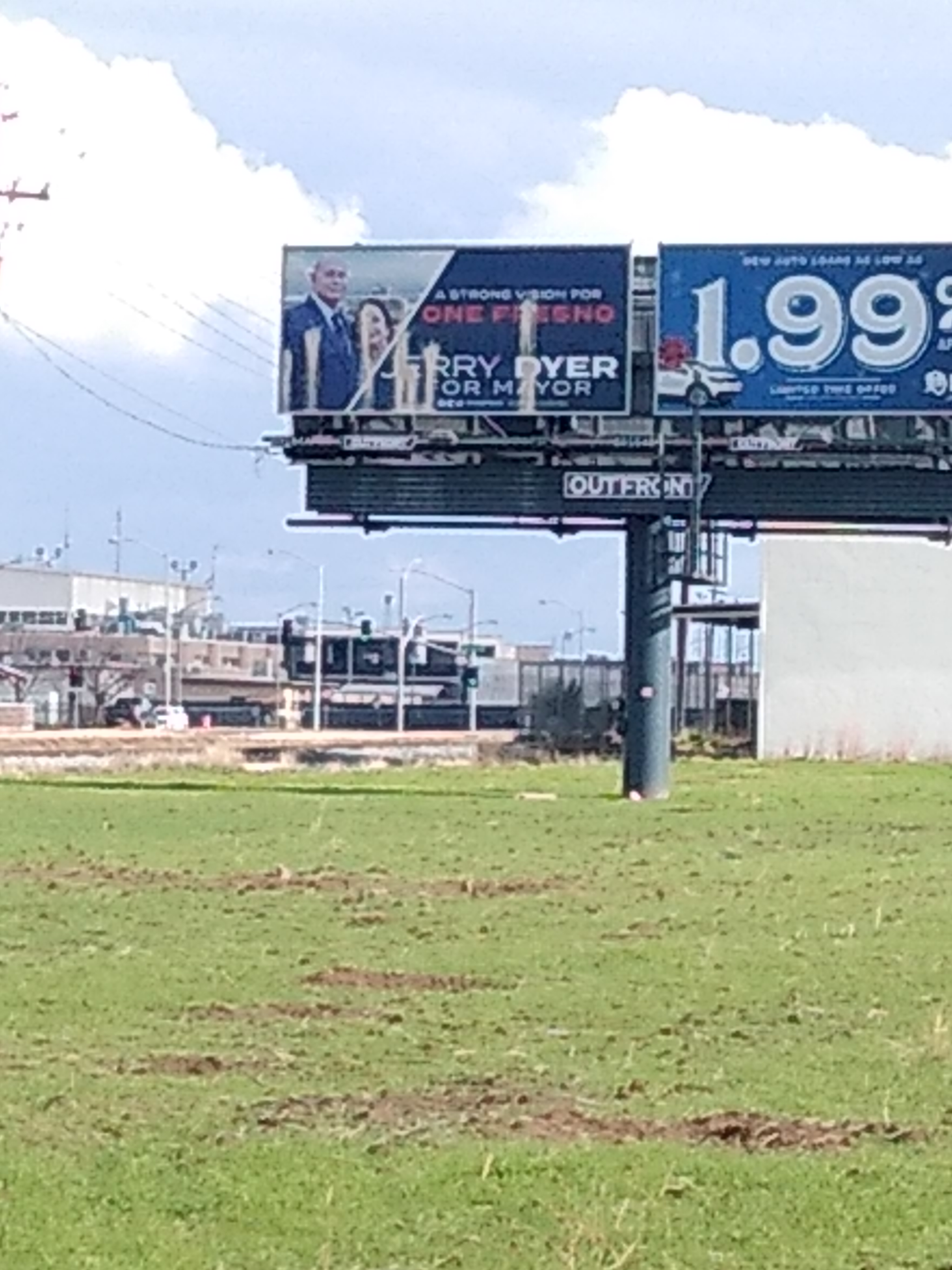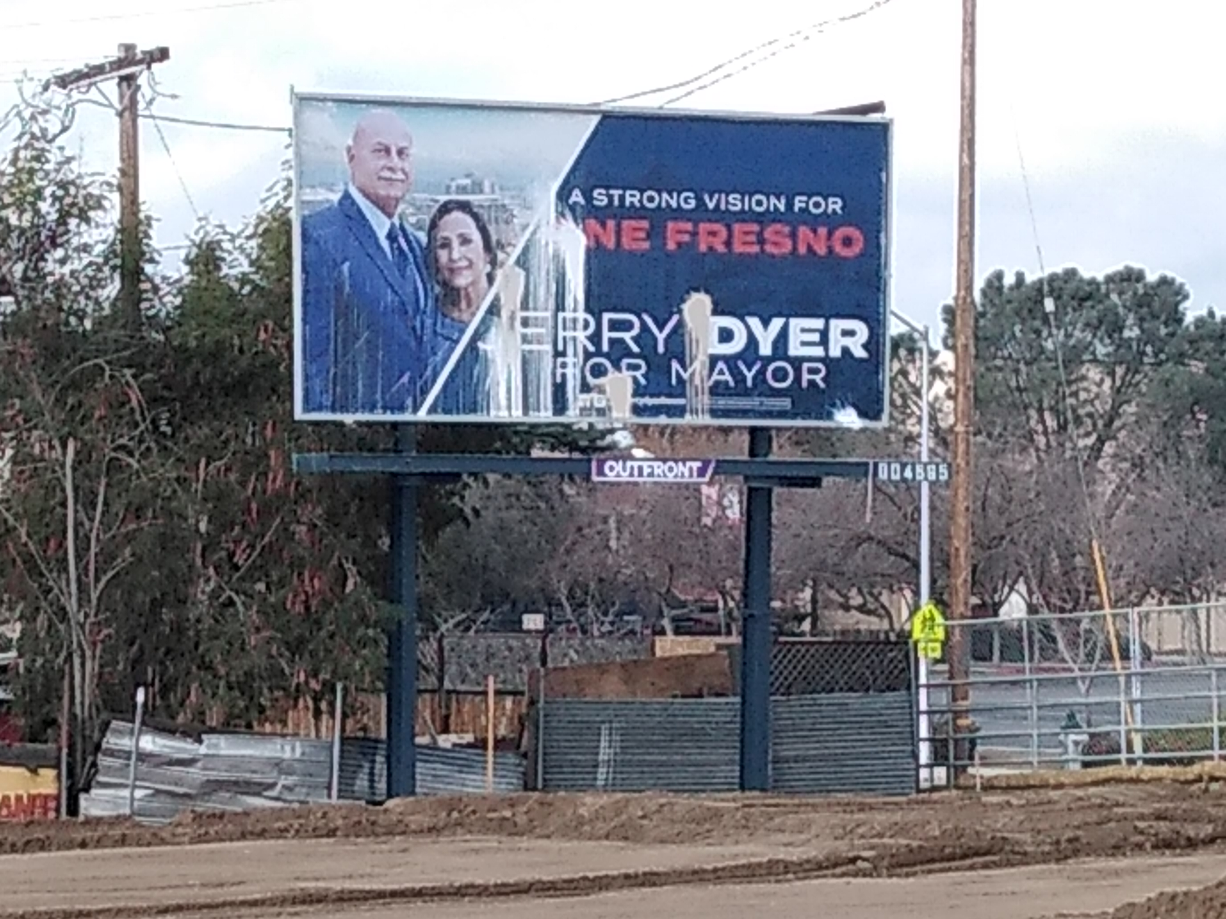 Fresnos retired rapist, murdering police chief campaign billboards appear to have been shit upon by huge birds.