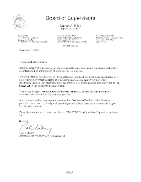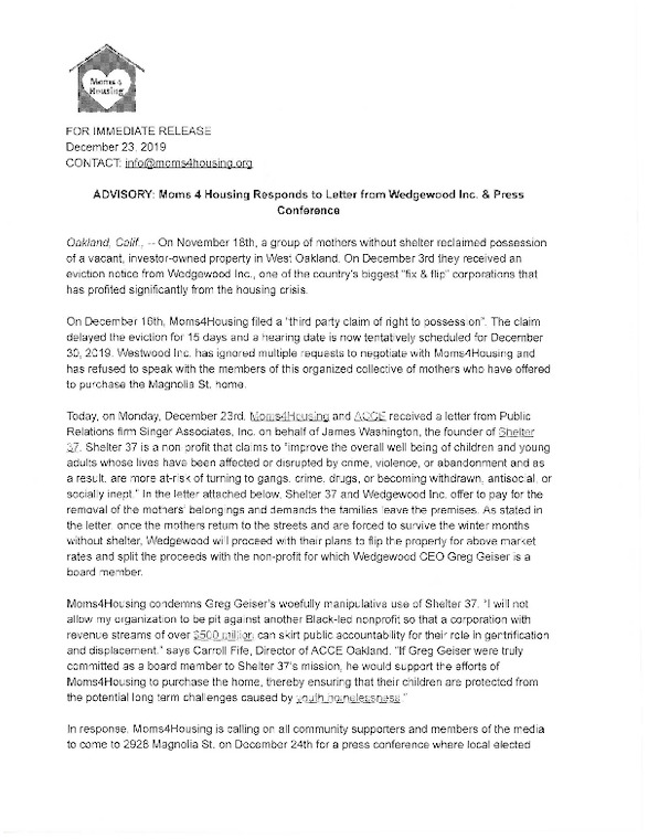 On Christmas Eve, Moms for Housing held a press conference to respond to a public relations ploy by Wedgewood LLC — using affiliated Los Angeles nonprofit Shelter 37 to attempt to soften the company's image as it seeks to evict them. Oakland councilmember Nikki Fortunato Bas and representatives for council members Rebecca Kaplan and Dan Kalb spoke on behalf of the moms.