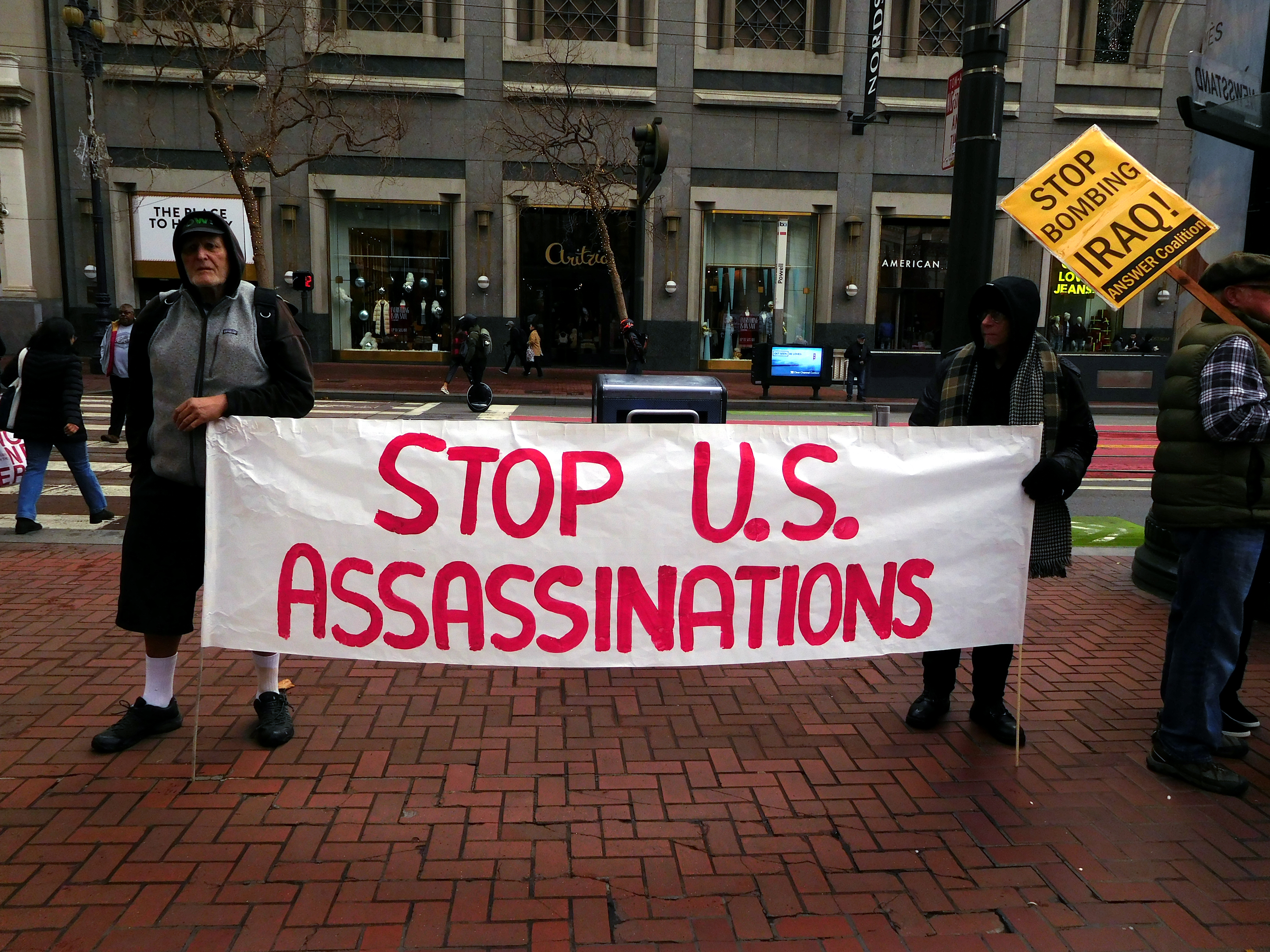 On Saturday, January 4, 2020, 2500 to 3000 people marched from Powell and Market to UN Plaza, proclaiming "US Out of Iraq" and "No War With Iran."