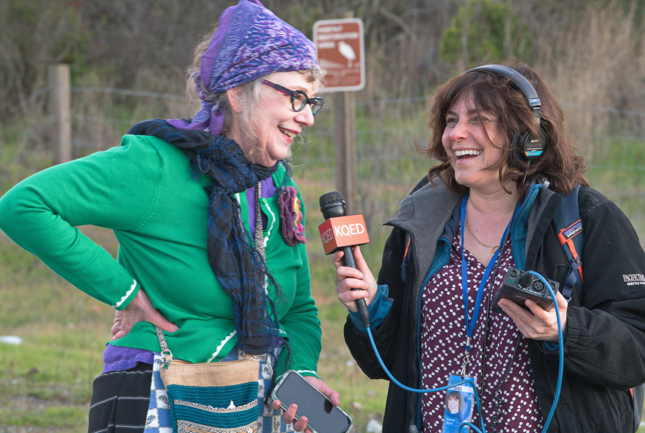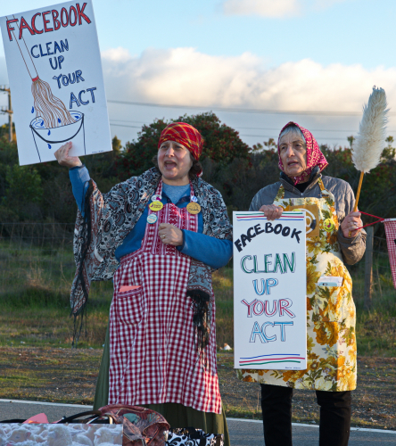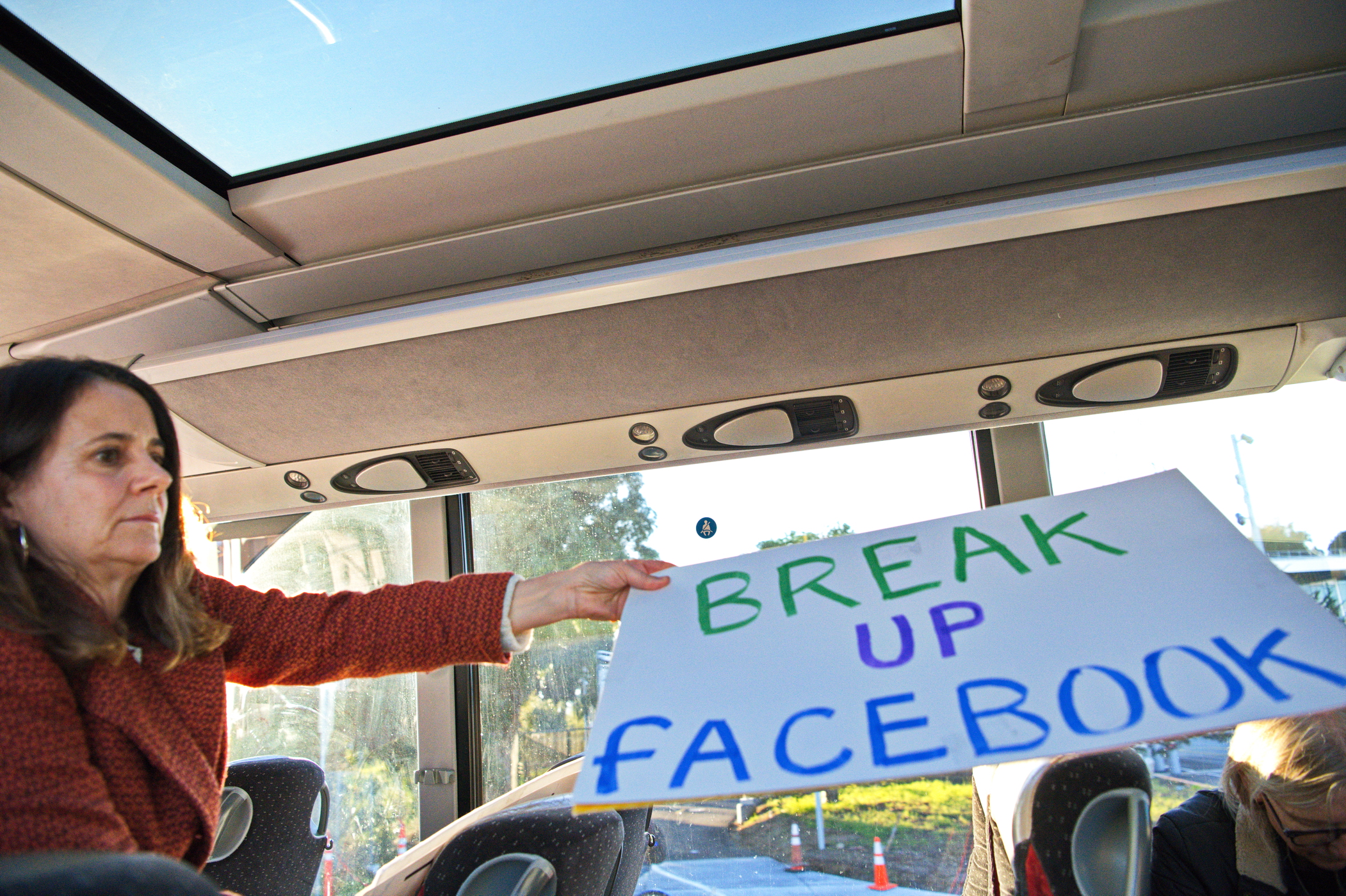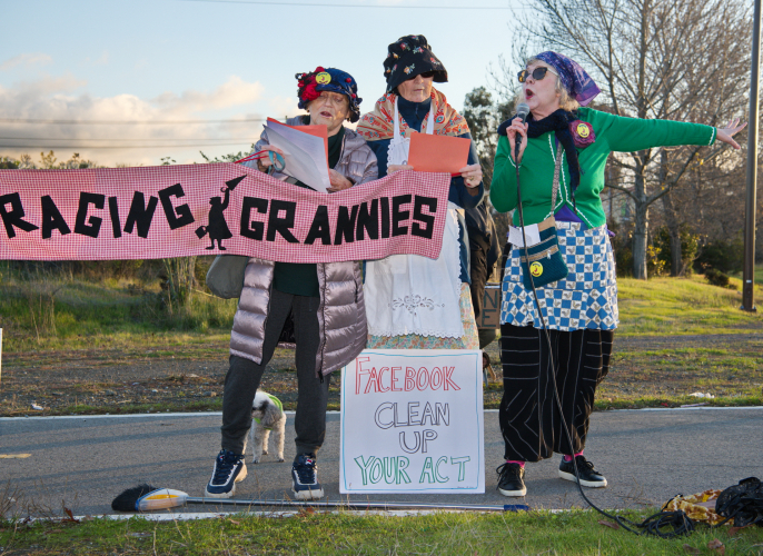 Among the various Bay Area groups demanding Facebook's breakup, the Raging Grannies, dressed in tasteful traditional colors and prints, sang and shouted slogans.