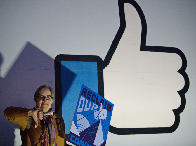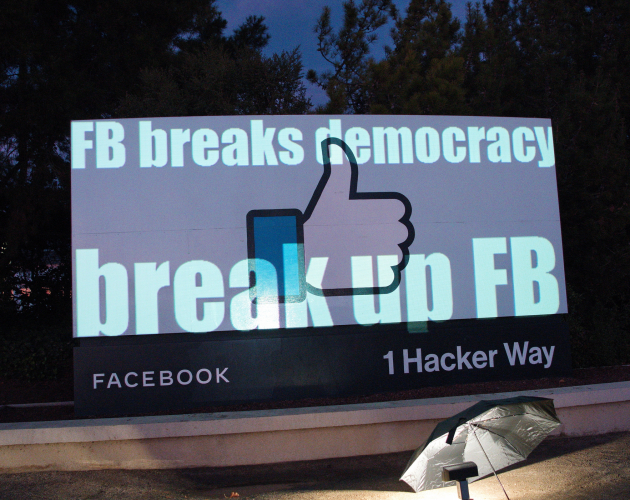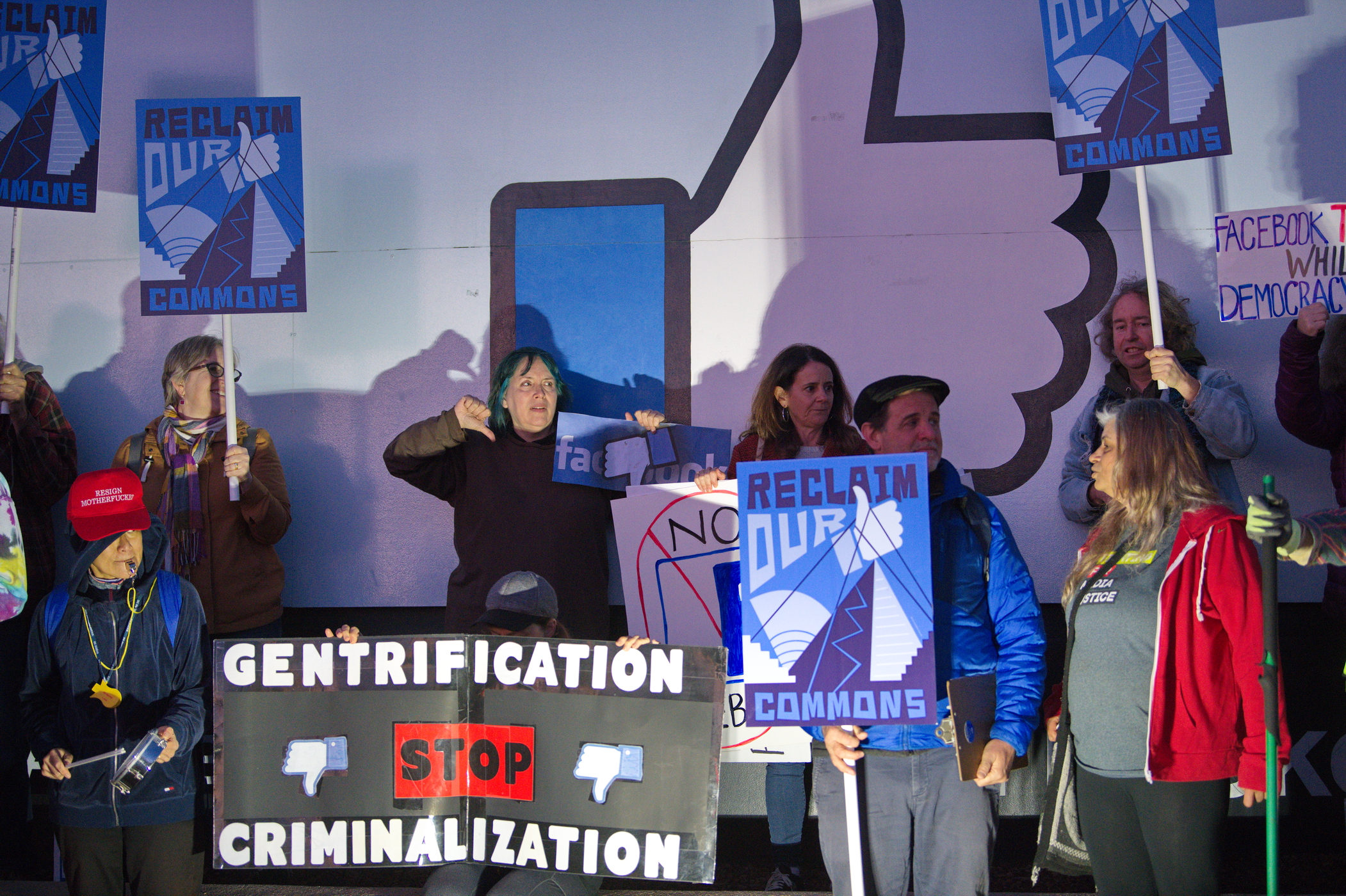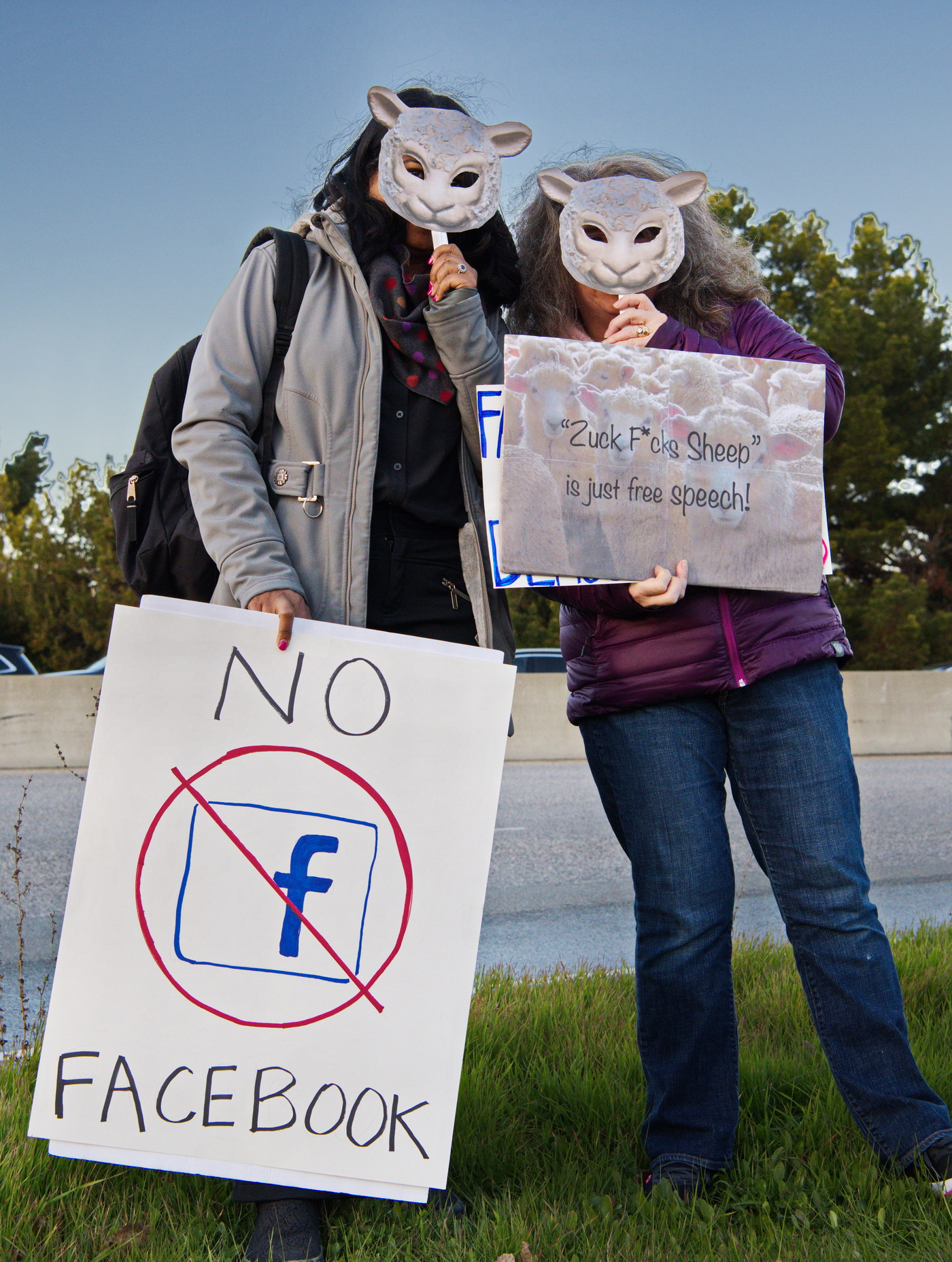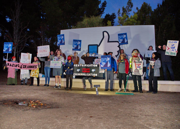 The protest ended with a march to the Facebook logo billboard on which a slide show demanded that Zukerberg resign and documented Facebook's various crimes.