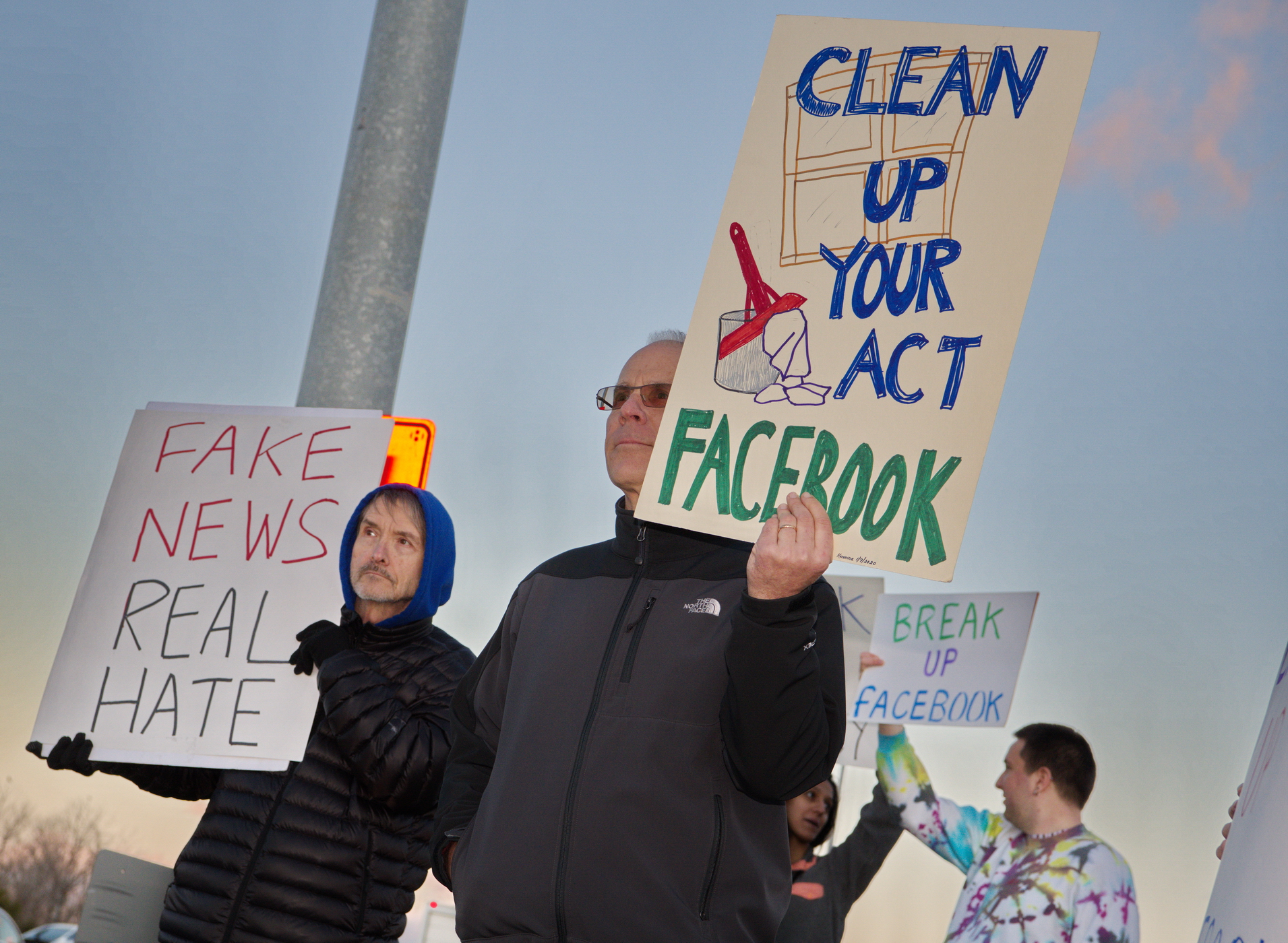 Jan 9, 2020, Menlo Park. Facebook headquarters located at, appropriately named, 1 Hacker Way, heard, in no uncertain way about how they are corroding the public dialog. Activists held signs protesting Facebook' s dissemination of false news, lies, propaganda and hate speech.