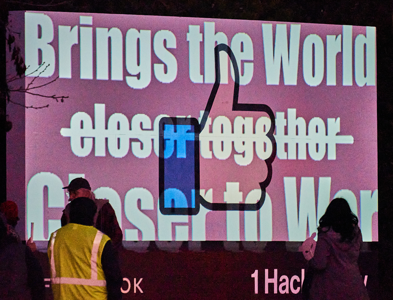Surprised rush hour commuters along Highway 84 in Menlo Park witnessed bright eye-catching slogans projected onto the famous thumbs up sign. "Ministry of Propaganda" and "Democracies Bought and Sold" were just two. Facebook's oft quoted saying "Facebook brings the world closer together" was crossed out changed to read "Facebook Brings the World Closer to War."