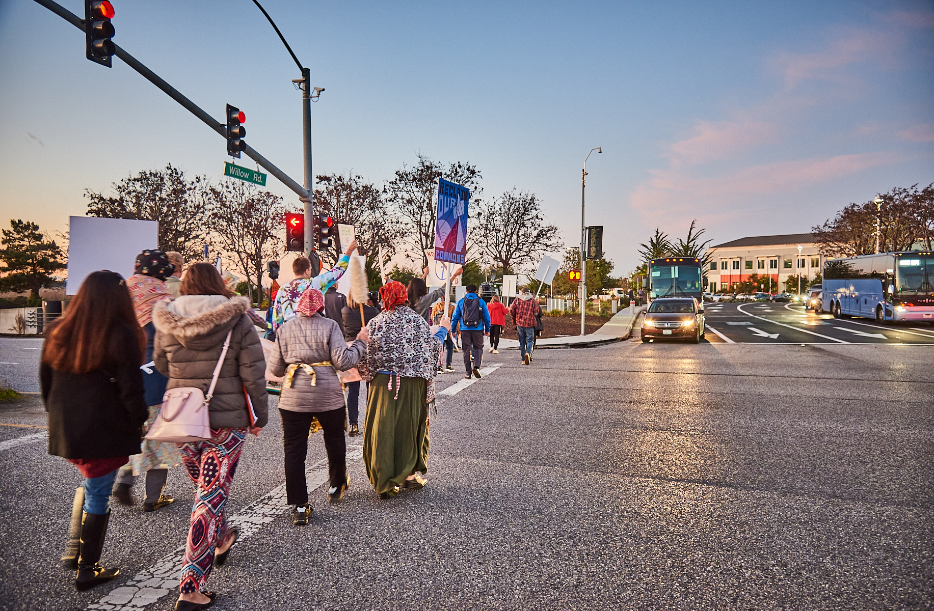 In the tradition of billboard liberators everywhere, activists projected slogans on to the giant thumbs up sign, also known as the "like" sign, outside Facebook Headquarters on January 9.