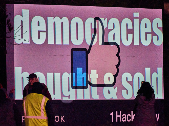 In a culture jamming action, demonstrators displayed their protest against the ubiquitous expansion of Facebook into public and private life. Through light projection technology, they superimposed the words "Fake News Real Hate" over Facebook's giant thumbs up "like" sign to call out the platform's political ad policy, which the company reiterated in recent days. Other projections followed, reading "Break Up Big Tech," "Democracies bought and sold," and more.