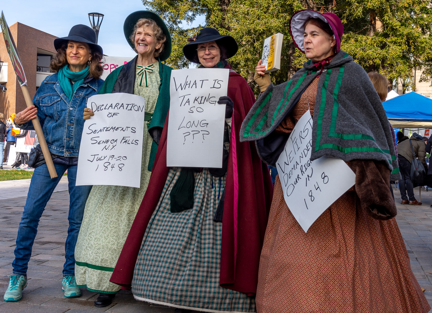 Indigenous, Pacific origin and Latina women raised placards on high; activists in 19th century costumes with billowing skirts recalled the first women’s rights convention in Seneca Falls, New York, in 1848. Others in sashes reminded people that 2020 marks the centennial of the 19th amendment that gave women the right to vote.
