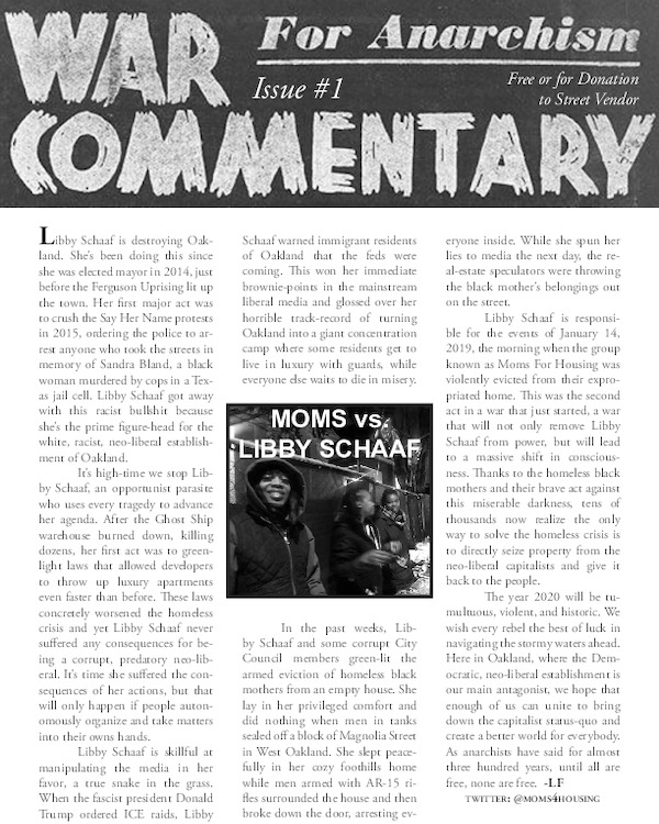 We're pleased to release the first issue of War Commentary, an anarchist news-sheet dedicated to chronicling the war between the forces of greed and the forces of liberation, specifically in the city of Oakland. We've already distributed several hundred copies across the city and have made it easily reproducible for those who have access to a printer, either at work or home. We hope to provide an outlet for people to say what they want to say about the state of Oakland, anonymously or not, without going through any established channels.