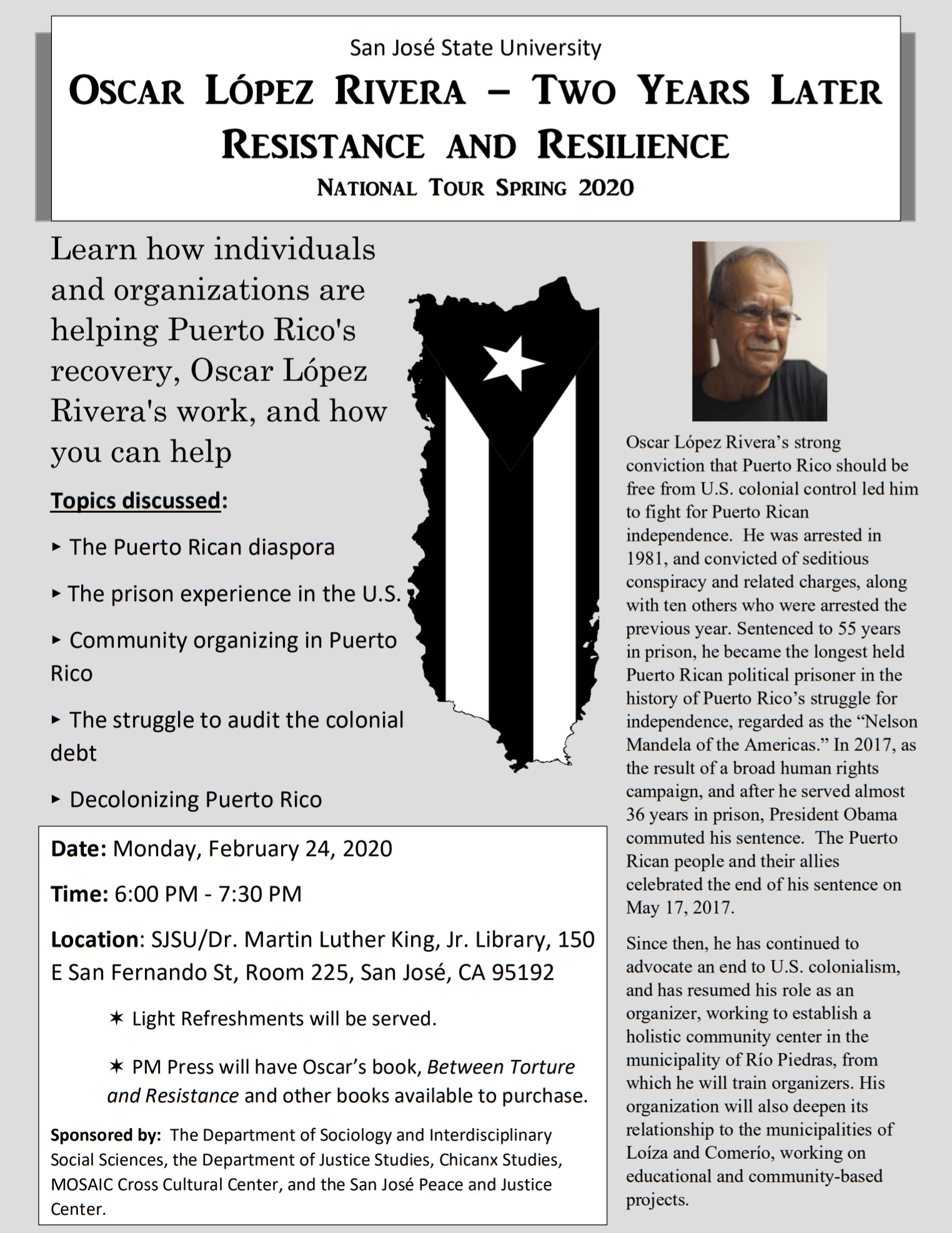 Sponsored by: The Department of Sociology and Interdisciplinary Social Sciences, the Department of Justice Studies, Chicanx Studies, MOSAIC Cross Cultural Center, and the San José Peace and Justice Center.