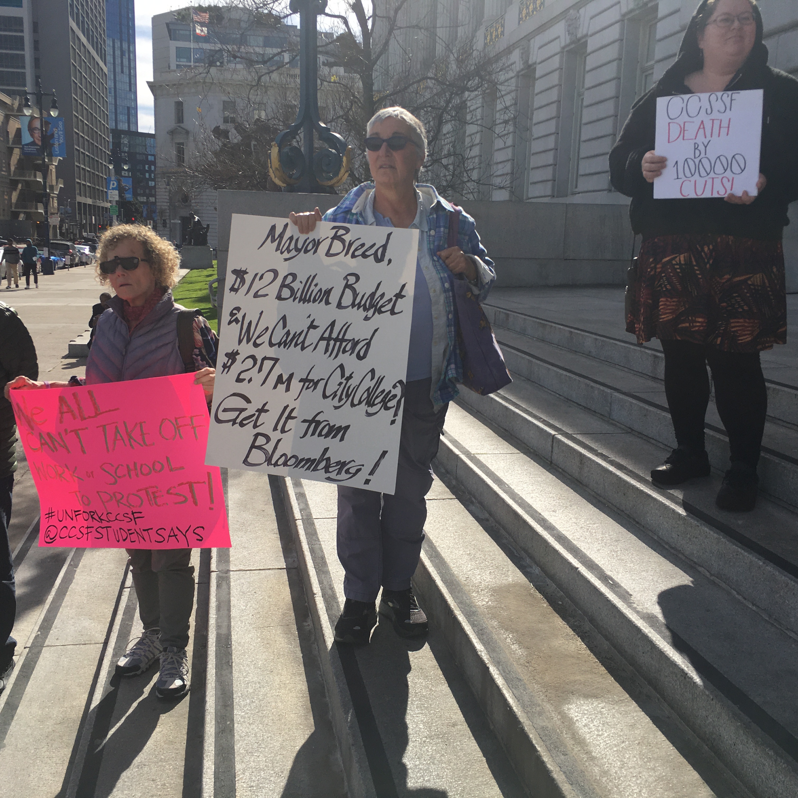 A rally was held at San Francisco City Hall to support $2.7 million for the re-institution of 300 classes that have canceled by the chancellor Mark Rocha with the support of the CCSF Board of Trustees