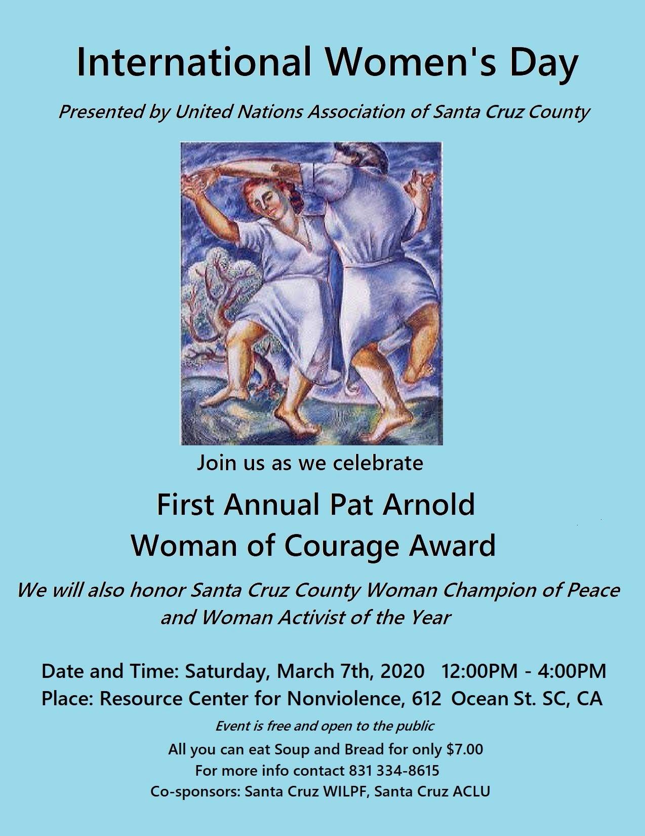 This year's celebration will be highlighted by the presentation of the First Annual Woman of Courage Award to a local woman who has demonstrated remarkable courage in the fight for human rights for all. The award is in Honor of Pat Arnold, long-term President of the UNA-SC who passed away on March 2, 2018.