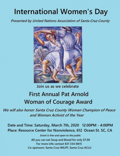 Come join us as we celebrate International Women's Day hosted by the United Nations Association of Santa Cruz County. This year's celebration will continue our tradition of offering a variety of soups and breads donated by local restaurateurs. A donation of $7 (sliding scale) is requested. The event is free and open to the public.