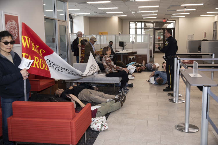 Demonstrators called on Big Oil’s largest lender, Wells Fargo, to halt its financing of fossil fuels and invest instead in clean energy solutions to the climate crisis. They took their protest of Feb 21 to a branch in Mountain View, CA where they had a die-in. This came on the heels of an action in which they occupied a branch in San Jose for nearly an hour the previous day.