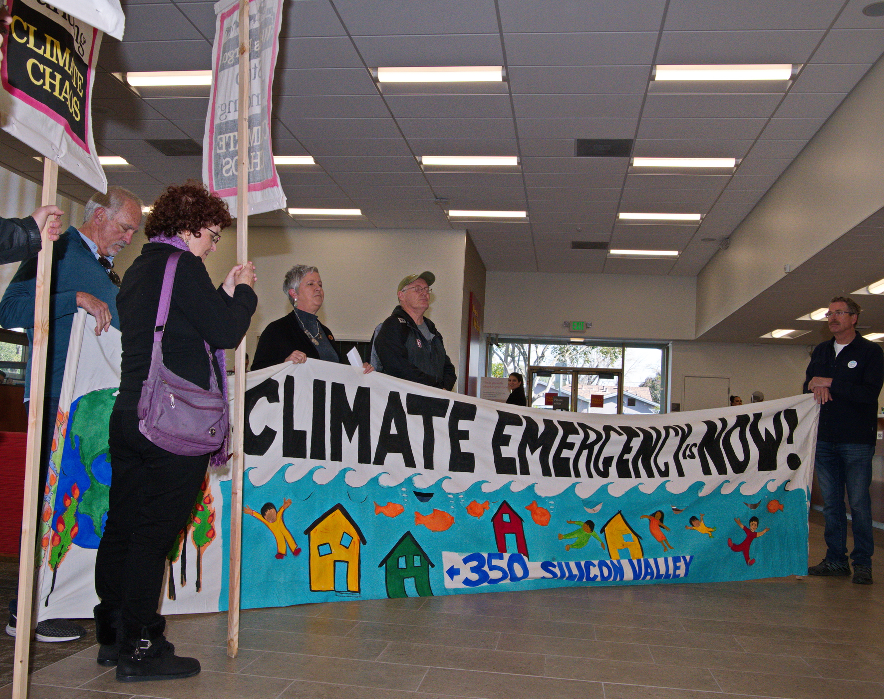 After assembling more or less surreptitiously behind a CVS on Lincoln Ave, about twenty protested with more or less hidden banners and signs, marched into the Wells Fargo branch.With the banner and signs deployed throughout banks customer area, they sang and chanted the message that Wells Fargo’s $172 billion a year financial support of the fossil fuel industry was destroying our environment.