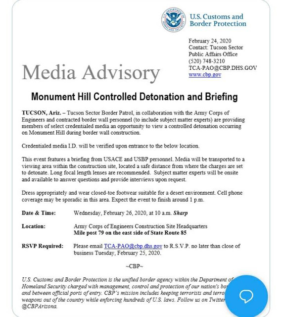 U.S. Customs and Border Protection, with the Army Corps of Engineers, is planning to carry out the detonation of Monument Hill and posted a notice for media viewing.