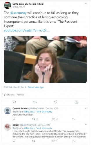 On December 26, the Santa Cruz, CA: Keepin' It Real Twitter page used the disparaging photo of Rachel McCullough-Sanden with the following caption in a tweet: "The @sccounty will continue to fail as long as they continue their practice of hiring-employing incompetent persons...like this one".