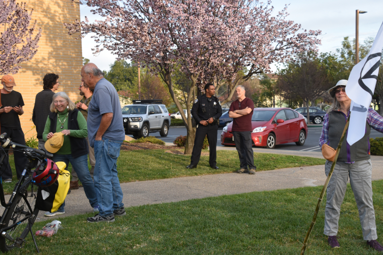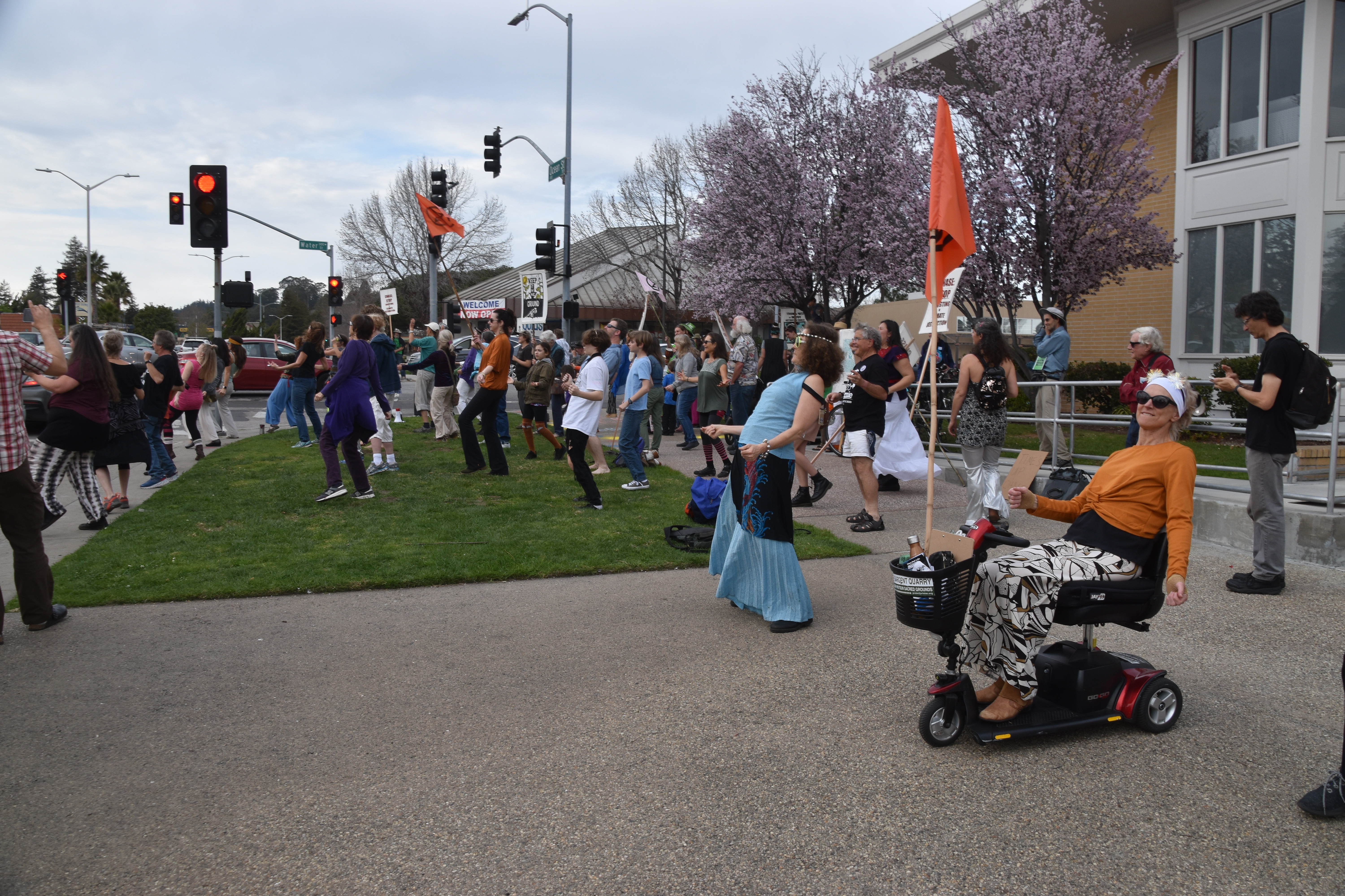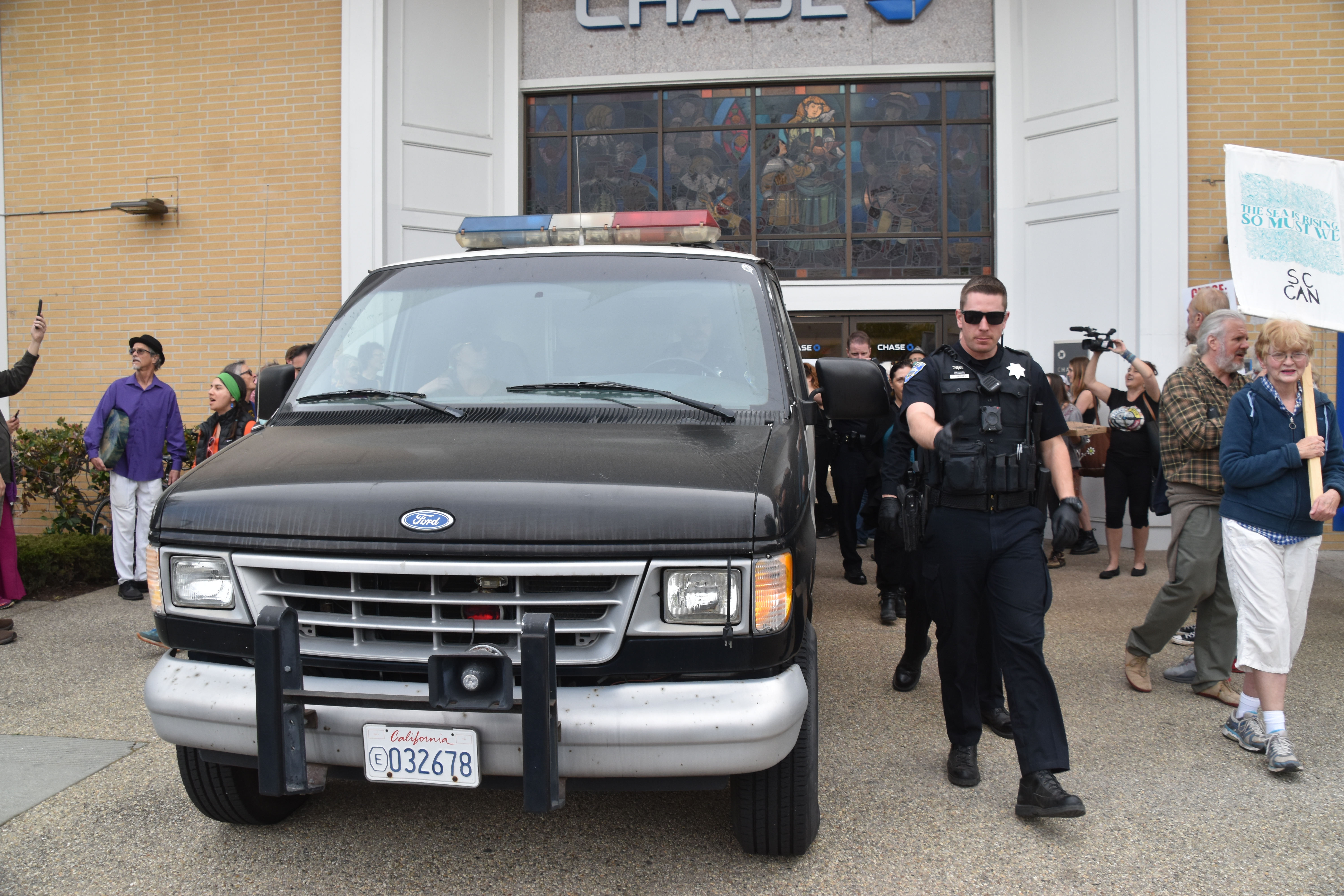 Yesterday afternoon I went to take photos of a flash dance/protest at the Santa Cruz Chase Bank on Ocean St. at Water St. I was aware that this was going to take place from 4 pm. to 6 pm. on this beautiful day here. While many folks danced and sang in front of the bank, five or six people stood in front of the teller's windows to stop any banking from being done. The bank closed for all business by about 4:30 pm. Many police officers gathered in the rear of the parking lot. The people that had chosen to partake in civil disobedience would later be arrested by Santa Cruz PD. for there brave action! Some people gathered at the back entrance of the bank to show support and they chanted and cheered for them as they were being put in a paddy wagon/van.