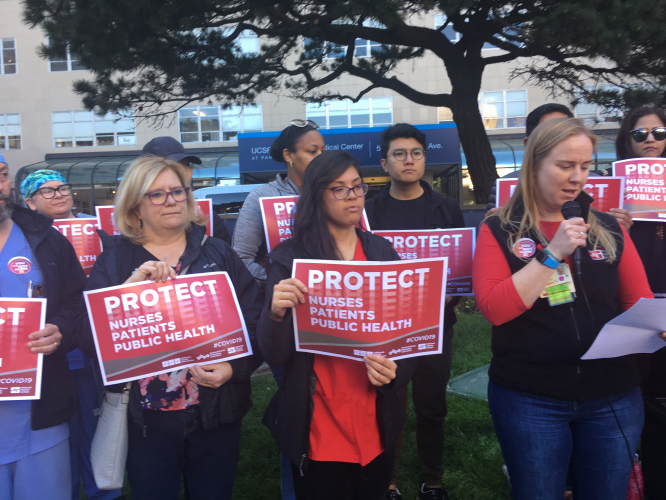 National Nurses Union CNA nurses at UCSF held a press conference to talk about the serious health and safety protection that is critical to healthcare providers and patients. They reported that they have to re-use masks, are understaffed and there is a lack of communication from management.