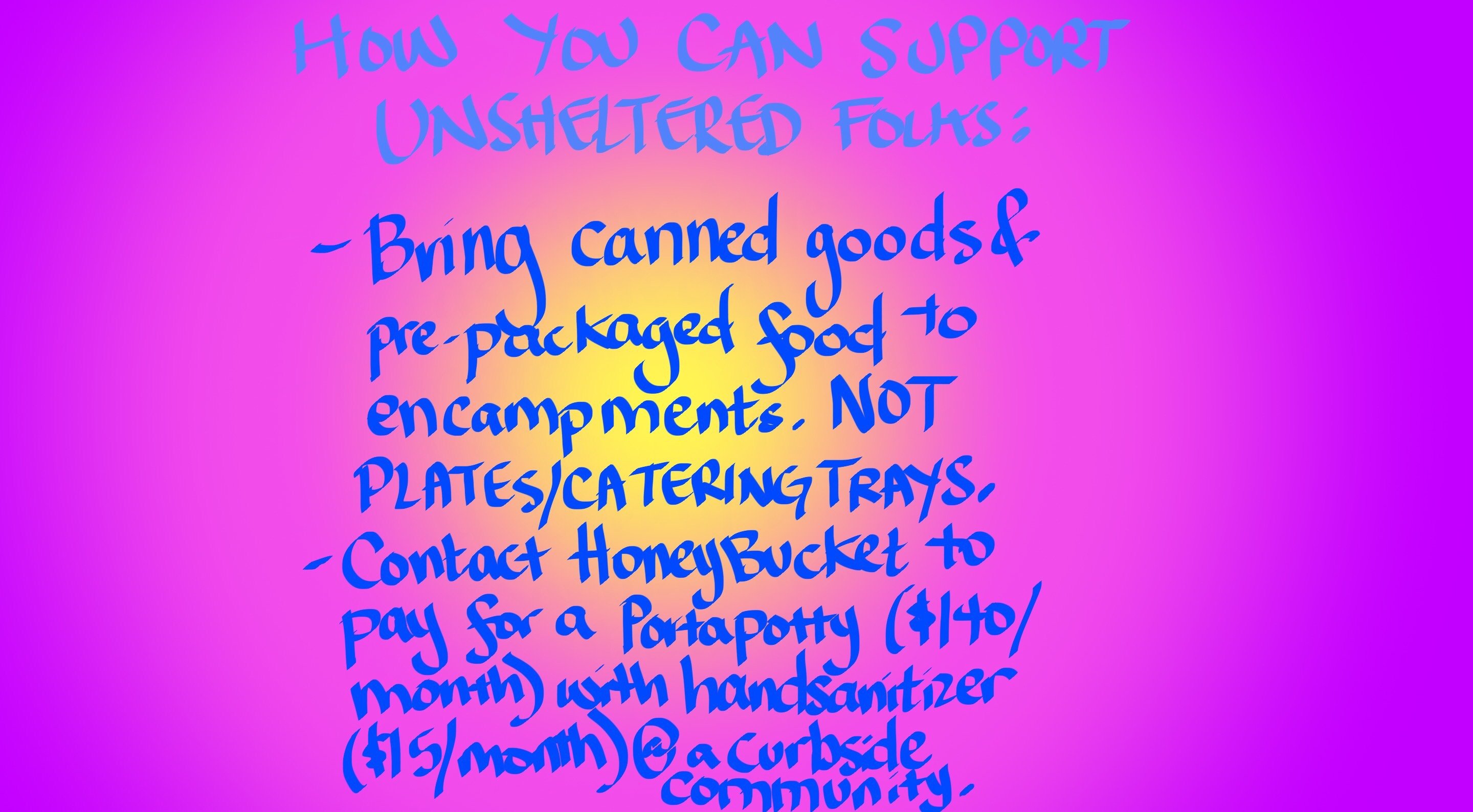 If you want to support your curbside neighbors, flood unhoused communities with bottled water, hand sanitizer, latex gloves, particle masks, and heavy duty contractor bags.