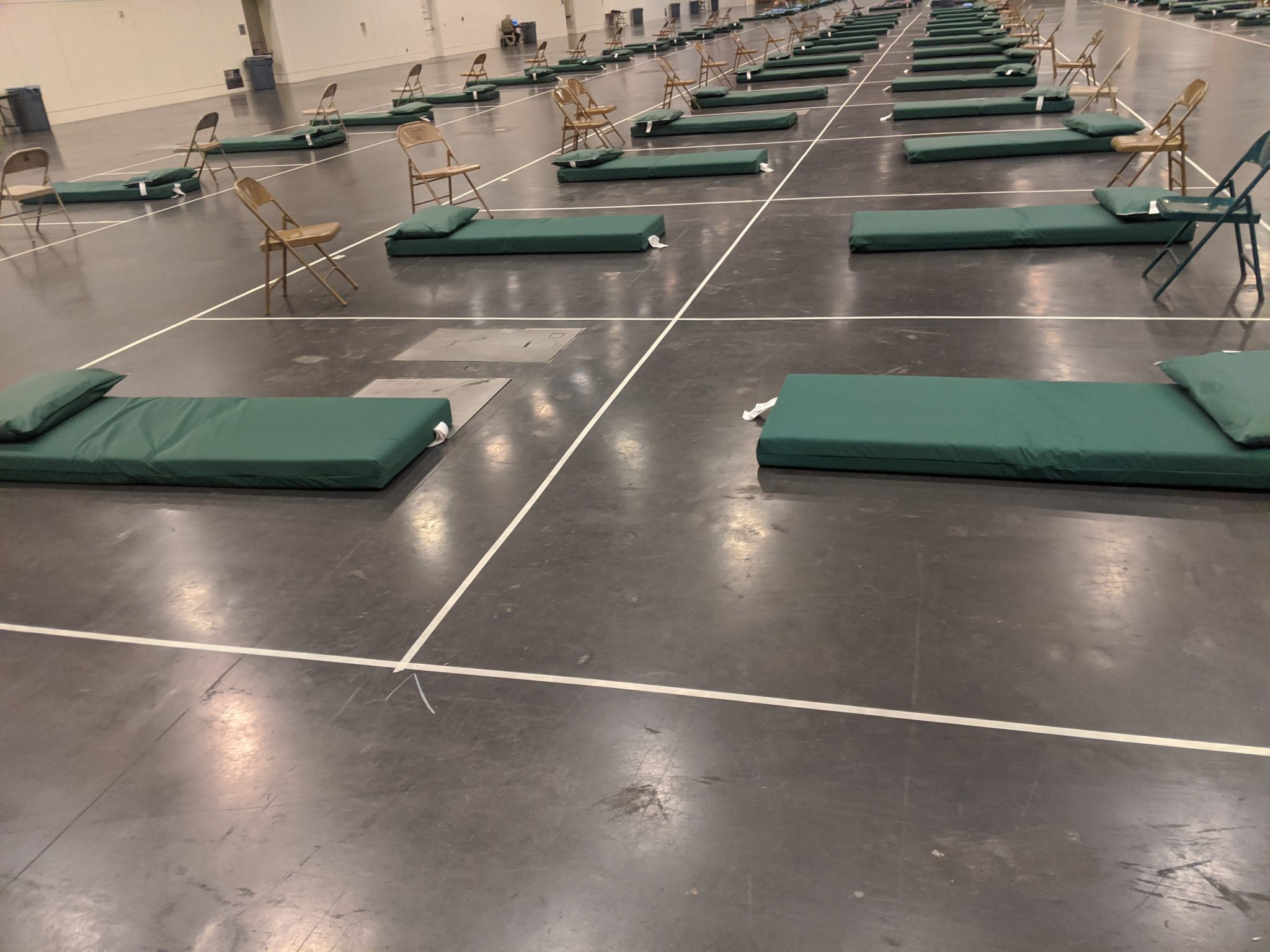 Right now there are 390 mats in the Moscone Center that they plan to fill with homeless people. An inside source who asked to remain anonymous reported that there are currently no hand-washing stations, bathrooms facilities are shared and limited, staff don’t have Narcan and there are no sharps containers. Folks coming in are not allowed to bring any property with them and are told they must leave all their belongings at their shelters. Mats on the floor are sectioned off with masking tape.