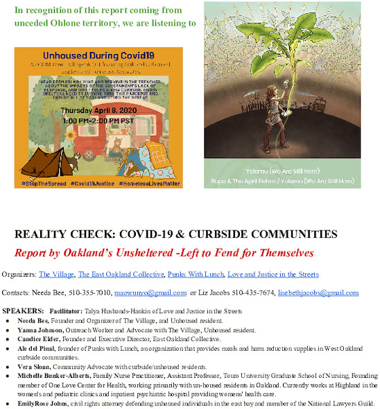 On April 9, homeless advocates held an online Town Hall to speak out about the crisis faced by Oakland's curbside communities during the coronavirus pandemic. Over 100 people watched and/or participated. Questions from the media were taken at the end of main panel discussion.