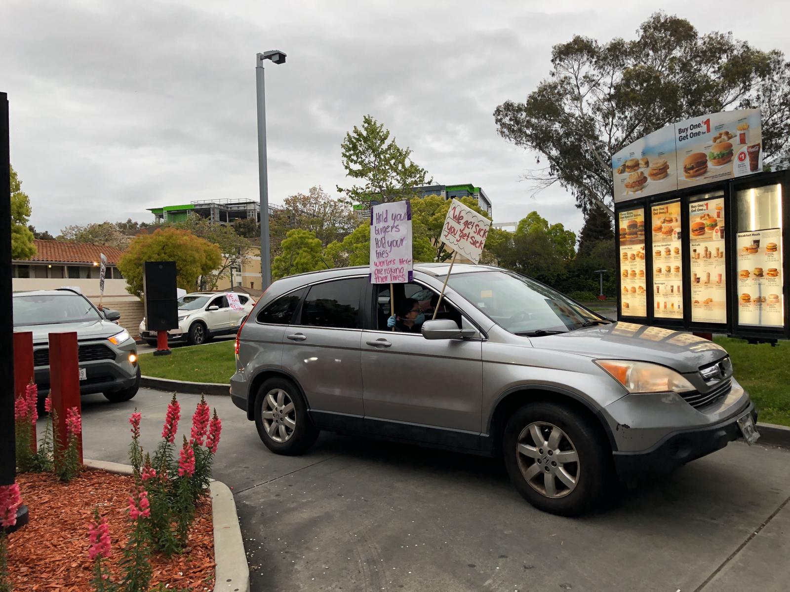 In the early morning of April 9, employees from several of the chain’s Bay Area locations gathered in the parking lot of a San Jose McDonald’s. They rallied outside of their cars, making a large circle in oder to maintain social distancing required by California law. They also formed a caravan of their cars to disrupt the drive-thru lane in an act of civil disobedience. SJPD kept a watchful eye from a vehicle parked next to the building.