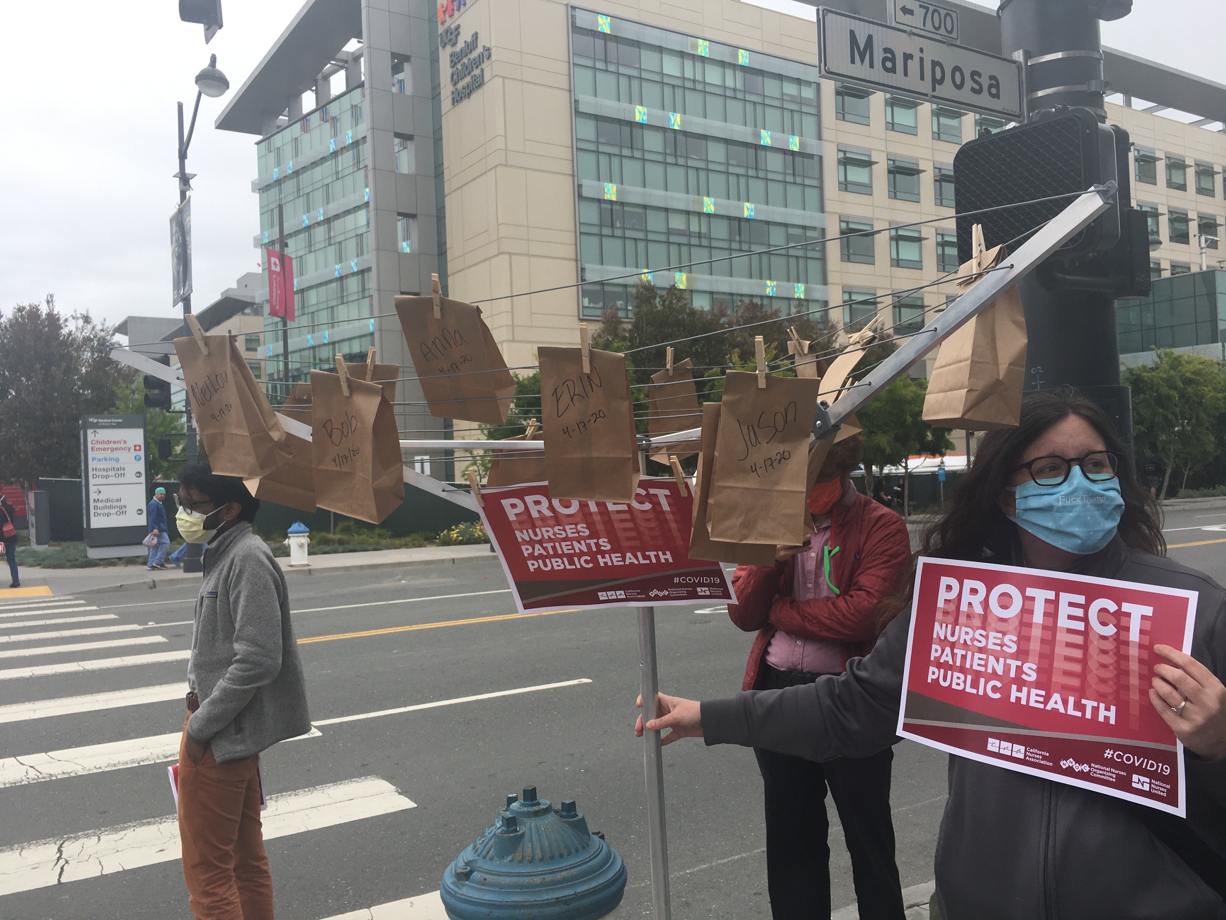 UCSF hospital workers who are members of NNU/CNA, UPTE, IBT, UAW and SEIU demanded at the UCSF Mission Campus hospital that healthcare workers get masks and proper PPE protection.
