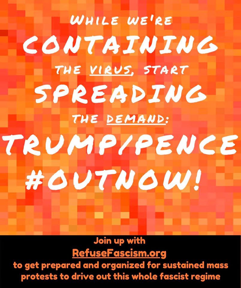 The Trump/Pence regime’s catastrophic response to the COVID-19 pandemic has already cost more than 50,000 lives in this country. Its attacks on science, embrace of end-times Christian fascists, its constant lying and bludgeoning of the very notion of truth, and white supremacist scapegoating of immigrants and foreigners threatens millions of more lives here and around the world. The U.S. now leads the world in COVID-19 cases and deaths.