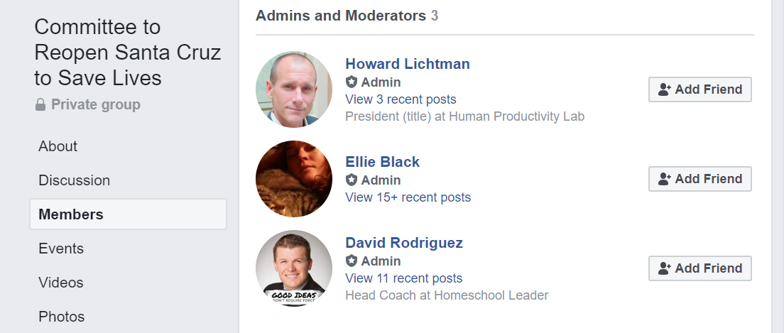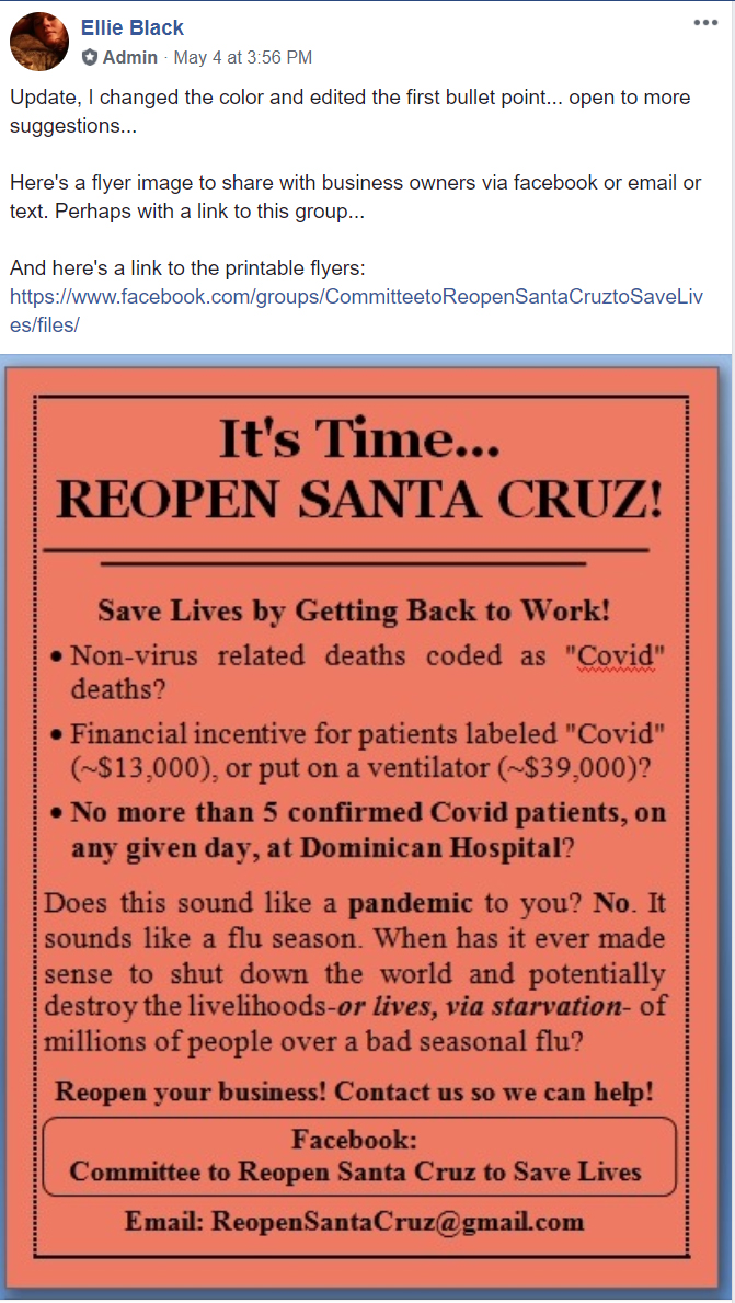 On April 30, the Committee to Reopen Santa Cruz Facebook group was created, with administrators listed as Ellie Black, Howard Lichtman, and David Rodriguez.