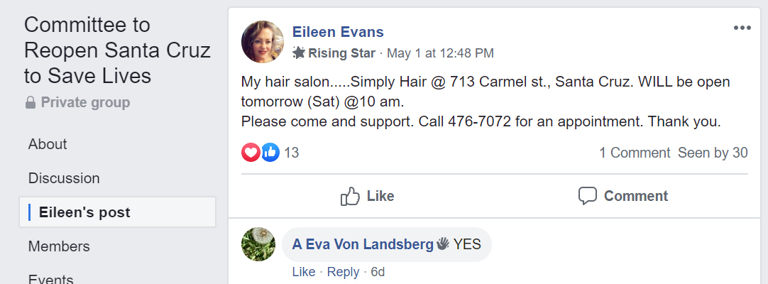 On May 1, Eileen Evans posted what looks like an ad to the Committee to Reopen Santa Cruz group stating that her hair salon, Simply Hair would be open on Saturday, May 2. “Please come and support. Call [...] for an appointment. Thank you,” she wrote. Evans then posted the “ad” to her business page the next day on Facebook.