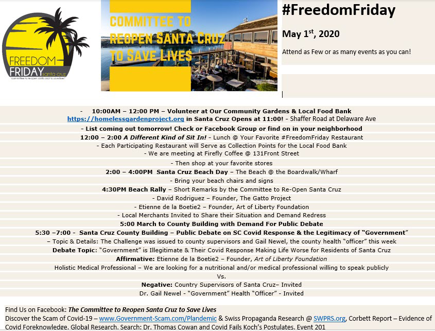 David Rodriguez and Howard Lichtman, who are not residents of Santa Cruz County, became extensively involved in the organization of the May 1 “re-open” protest in Santa Cruz, which they called "Freedom Friday". Rodriguez and Lichtman have collaborated on political projects together for years.