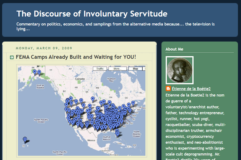 In a post from March 9, 2009 titled "FEMA Camps Already Built and Waiting for YOU,” Lichtman posted a map of “future” FEMA camp locations and wrote:
