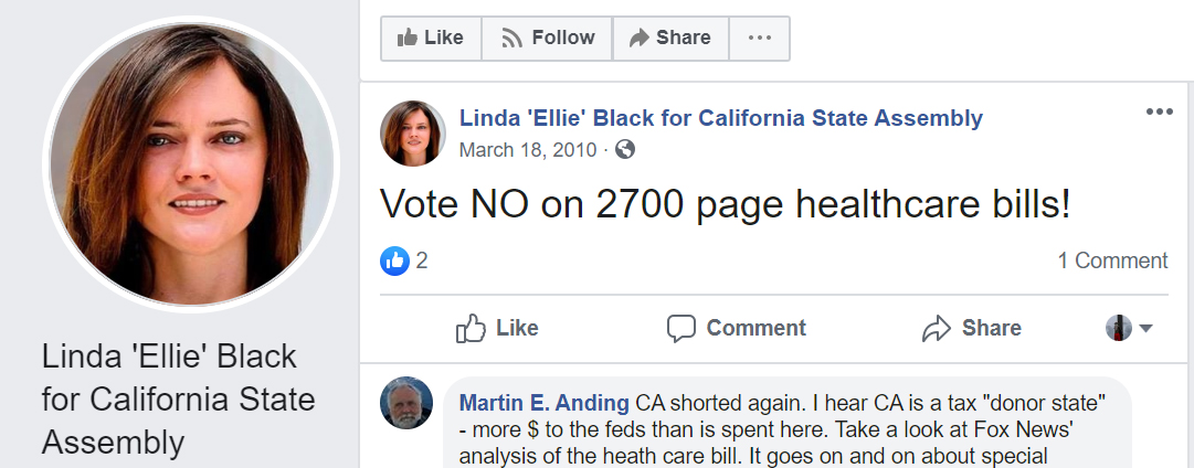 "Vote NO on 2700 page healthcare bills!" Black wrote on her campaign's Facebook page on March 18, 2010.