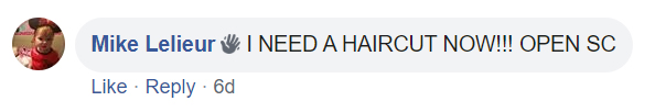 In Facebook group discussions to organize their upcoming protest on May 8, Mike Lelieur suggested the idea of creating a protest sign that reads, "I need a haircut now! Open SC!"