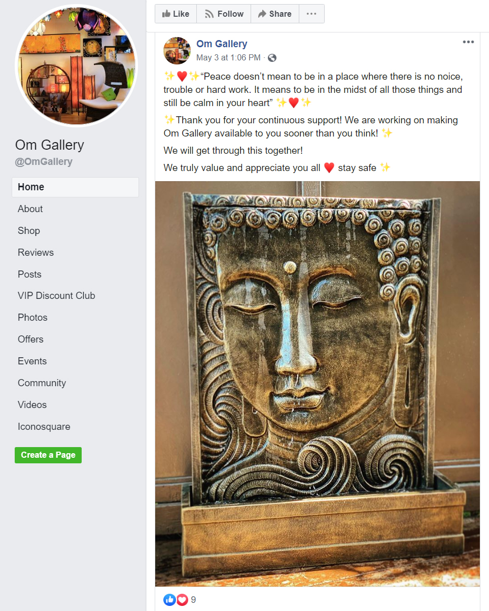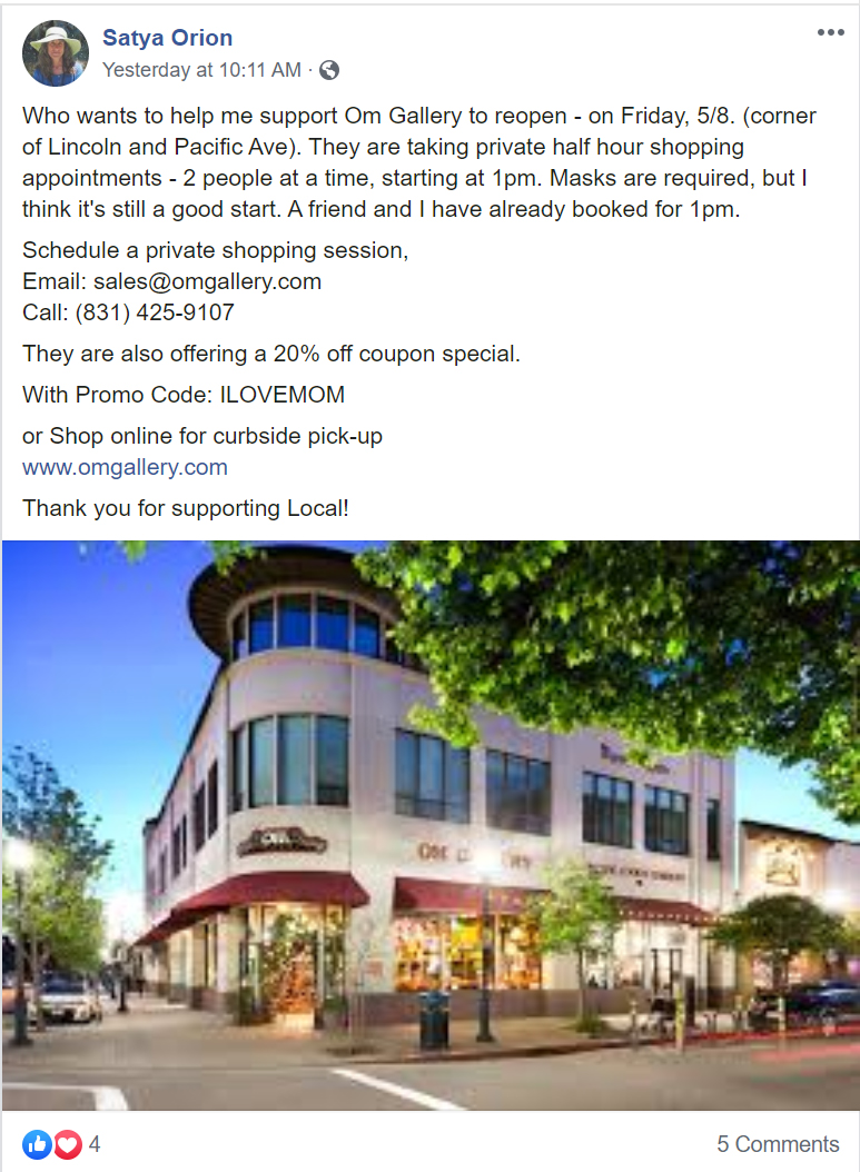 On May 3, the Om Gallery, which is located on Pacific Avenue in downtown Santa Cruz, posted a message on their Facebook page suggesting they were opening. “Thank you for your continuous support,” the post read. “We are working on making Om Gallery available to you sooner than you think!” The Om Gallery is a new age/religious themed gift store that sells crystals, paper lamp shades, and other gifts. On April 20, a customer left a review for the Om Gallery on Facebook, stating that she had shopped at the store, which was outside of the County’s health restrictions.
