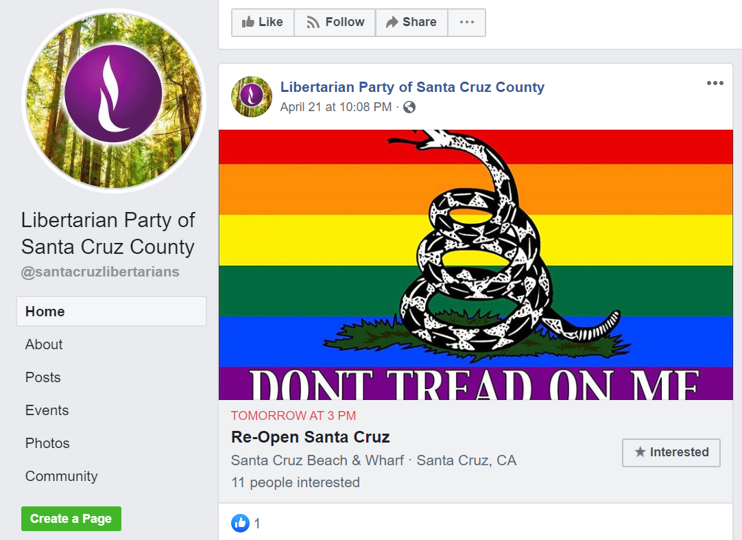 Two "Re-Open Santa Cruz" protests have been organized to date. On April 24, Libertarian activist and UC Santa Cruz student Sean Cutler obtained a permit from the City of Santa Cruz for a protest at City Hall that was attended by a handful of individuals. The April 24 protest was promoted by the Libertarian Party of Santa Cruz County on social media, and individually by the local party's Chairperson, Paul Lazaga.