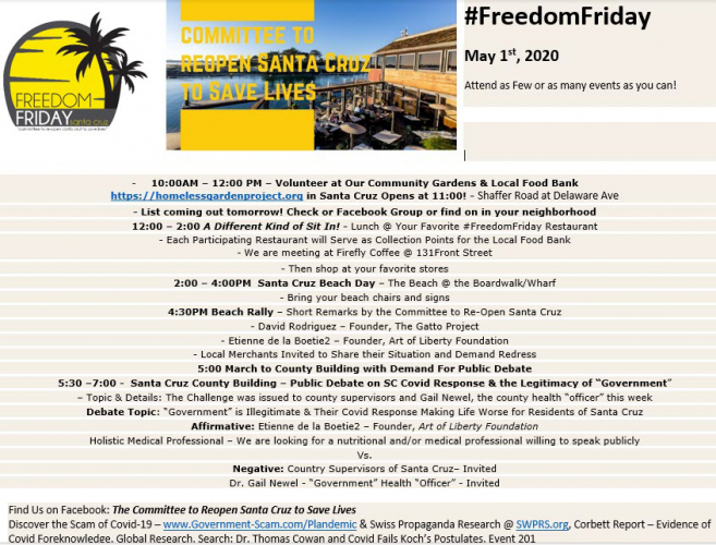 On May 1 the Committee to Reopen Santa Cruz posted photos of the group eating together at Firefly Cafe, stating they conducted a meeting at the business prior to that day’s Freedom Friday protest. The protest itself drew about two dozen participants who held signs near Cowell Beach. Howard Lichtman spoke ("Etienne de la Bootie2" was listed on an event flyer as a speaker at the protest).