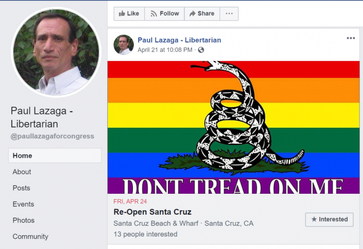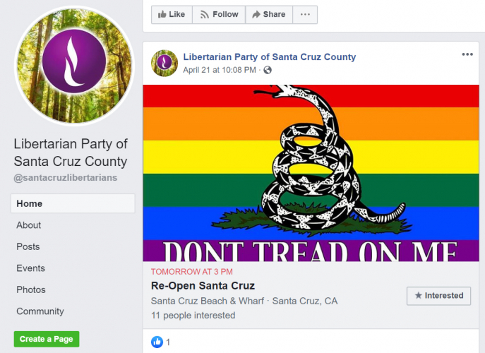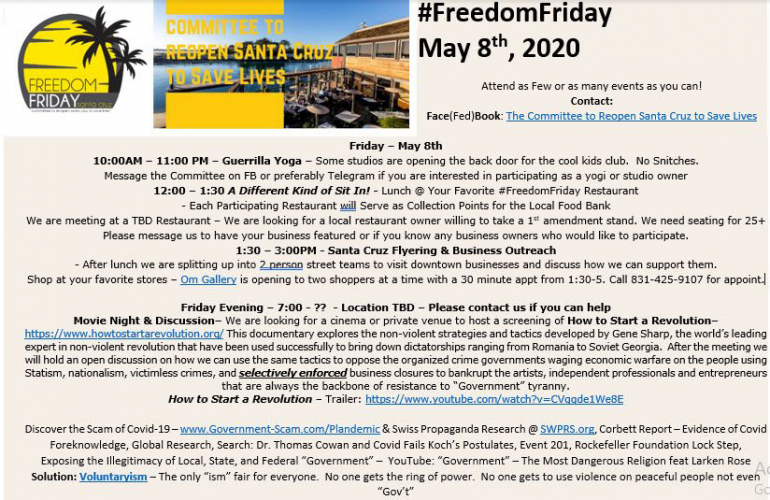 The "Committee to Reopen Santa Cruz,” a group founded recently by right wing extremists who believe the COVID-19 Pandemic is a hoax, is prodding local businesses to open early. The group has announced that the Om Gallery on Pacific Avenue is opening to two shoppers at a time from 1-5pm on Friday, May 8, by appointment. The Committee to Reopen Santa Cruz also plans to do "guerrilla yoga" at a studio that will secretly open its doors for the group. "Some studios are opening the back door for the cool kids club. No Snitches," a flyer for a May 8 "Freedom Friday" protest states. On May 6, the Santa Cruz County Health Officer updated restrictions to retail businesses to now include curb side delivery, but non-essential businesses are still being prohibited from allowing customers inside their stores. The Committee to Reopen Santa Cruz was founded by an unlikely trio: Santa Cruz local Linda "Ellie" Black, the former Republican State Assembly candidate who lost to Bill Monning in 2010; David Rodriguez, an education consultant and Libertarian activist from San Jose; and Howard Lichtman, a tech consultant from Ashburn, Virginia, who is also known as "Etienne de la Boetie 2," a right wing conspiracy blogger who has published over 300 entries since 2005, including support for the Oath Keepers, a far-right, racist organization associated with the militia movement.