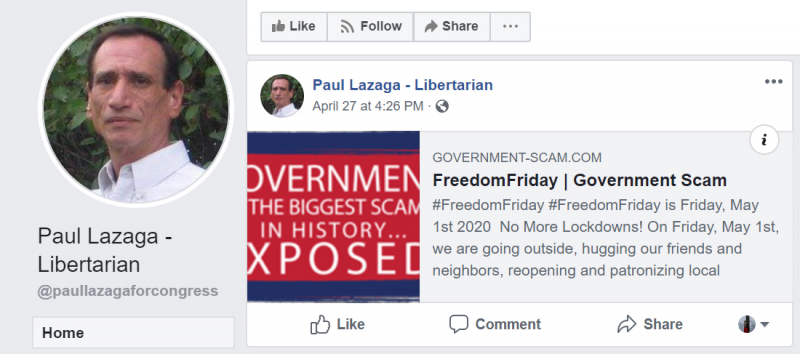 "Coronavirus is a giant hoax against humanity," David Rodriguez posted. "The government has zero authority to shut down small businesses so we're fighting to help reopen these businesses."