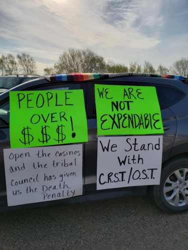 "We are not expendables," read the signs. "Open the casinos and the tribal government has given us the death penalty."