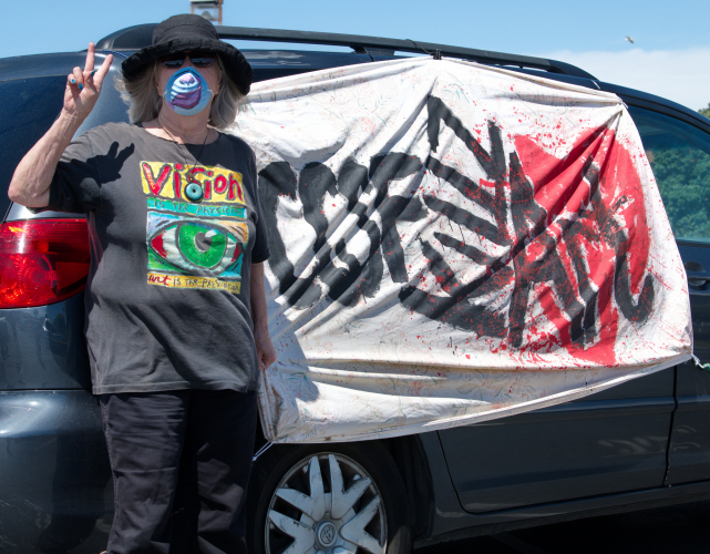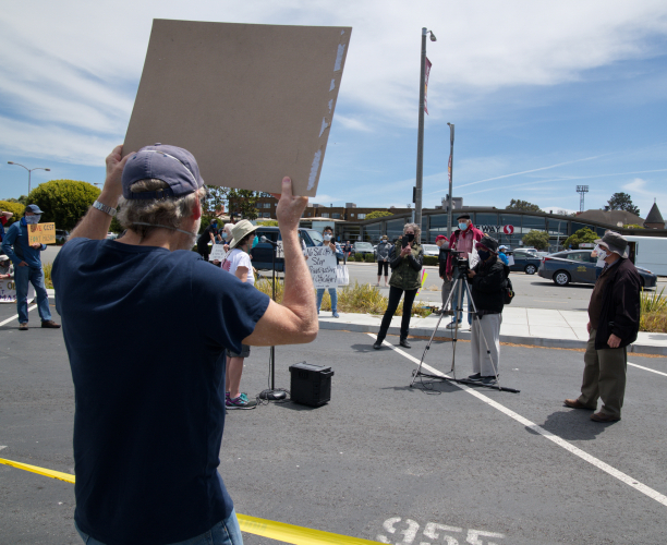 At the Community College of San Francisco, (CCSF) a Friday noon protest caravan set out for Fort Mason. They joined a protest in progress in front of Fort Mason's entrance.Addressing a socially distancing group, people from HEAT (Higher Education Action Team) protested cuts in programs held at Fort Mason that benefited seniors, immigrant and working people in general.