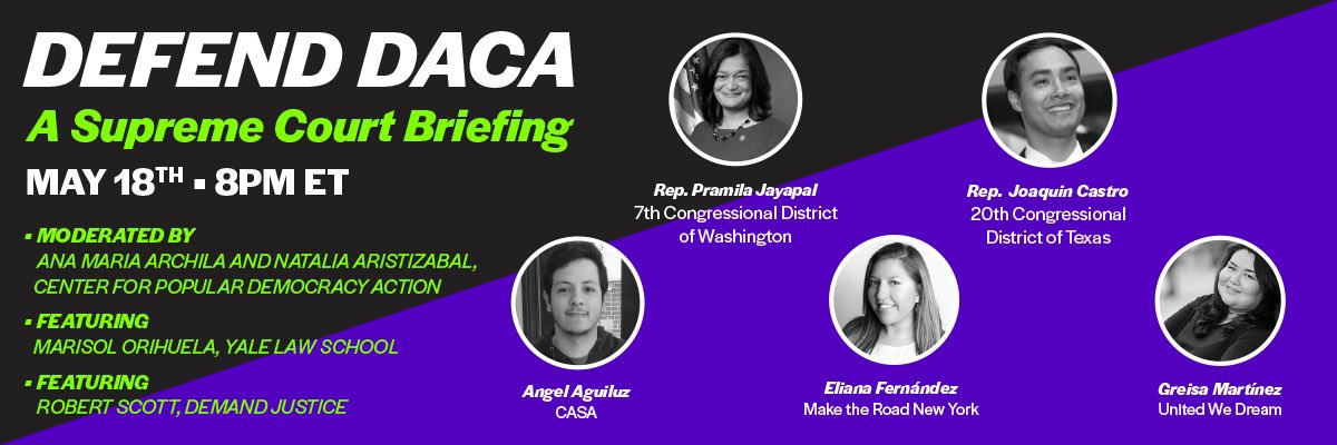 As we await the Supreme Court’s decision, join Rep. Pamila Jayapal, Rep. Joaquin Castro, Marisol Orihuela, and leading experts and advocates from the Center for Popular Democracy, Make the Road New York, United We Dream, CASA, and Demand Justice for a briefing about what’s at stake and how we can show our support for Dreamers.