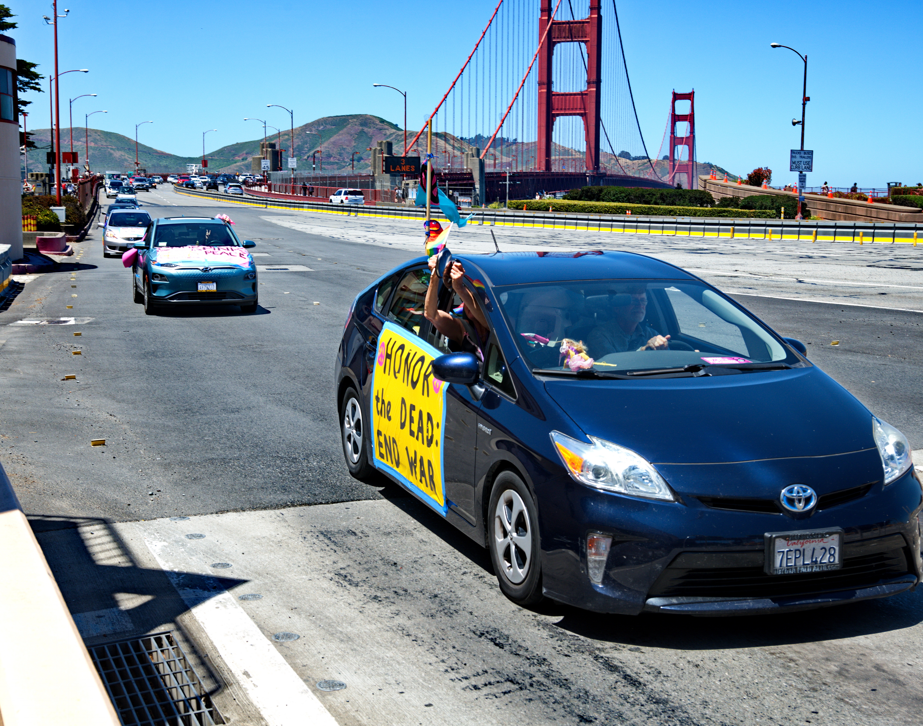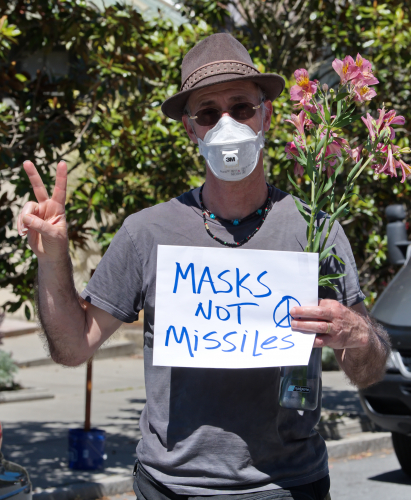 On a warm Memorial Day with California slightly relaxing its lockdown, a Code Pink car caravan delivered an anti war message to the steps of Senator Diane Feinstein's Pacific Heights $10 million mansion.After assembling in the parking lot of Marin's Peace Lutheran Church, the caravan, complete with its "Ghandhimobile Caboose" crossed the Golden Gate Bridge and wound its way past the San Francisco National Cemetery, down a section of Lombard Street and up to the Feinstein mansion.