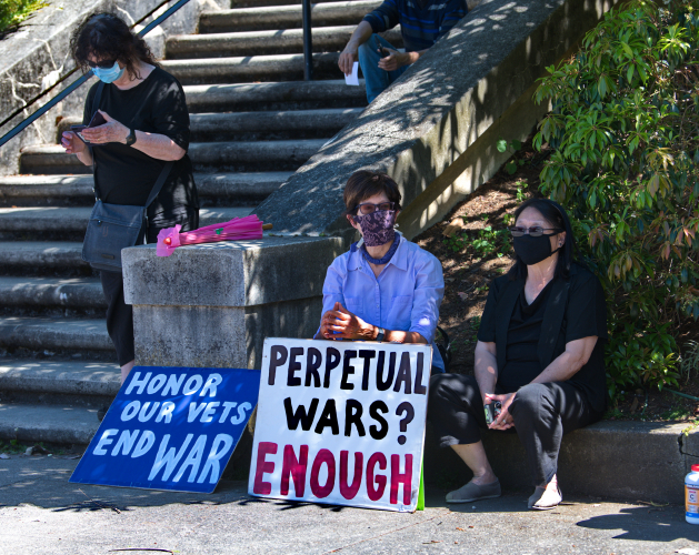 In Memorial Day Action, Code Pink brings anti-war message to the steps of her San Francisco mansion.