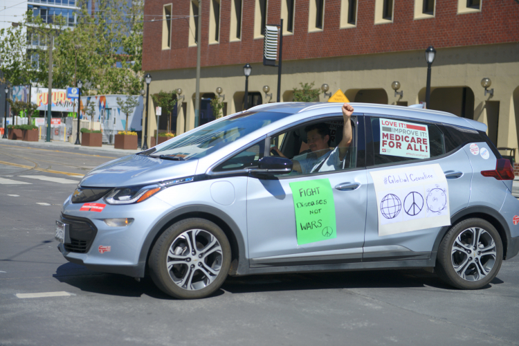 "The money and resources we use for the military only feed endless wars and wreaks havoc overseas. Now, with COVID-19, we are putting the U.S. public, and the world’s health in peril," stated Charlotte Casey of the San Jose Peace and Justice Center. The Peace Center, established in 1957, organized a caravan to call out for social justice and demand human rights to health, housing, education, a living wage and all the components of a dignified life.