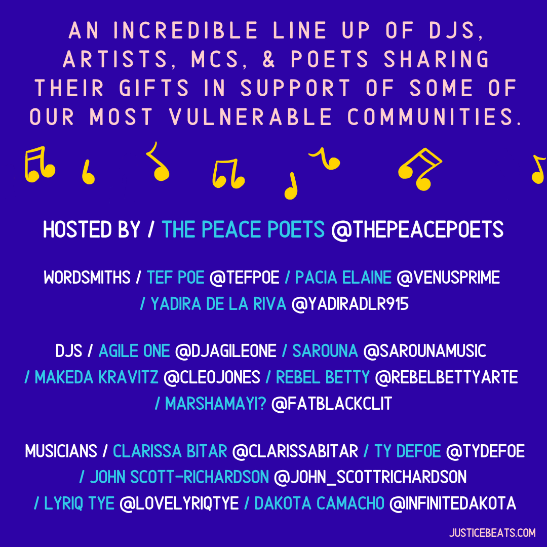 So we hope you will join us on tomorrow, Saturday May 30 for JUSTICE BEATS: a virtual festival to benefit communities in urgent need. All day on Saturday, we'll be amplifying musicians, DJs, and other artists working to support their communities.