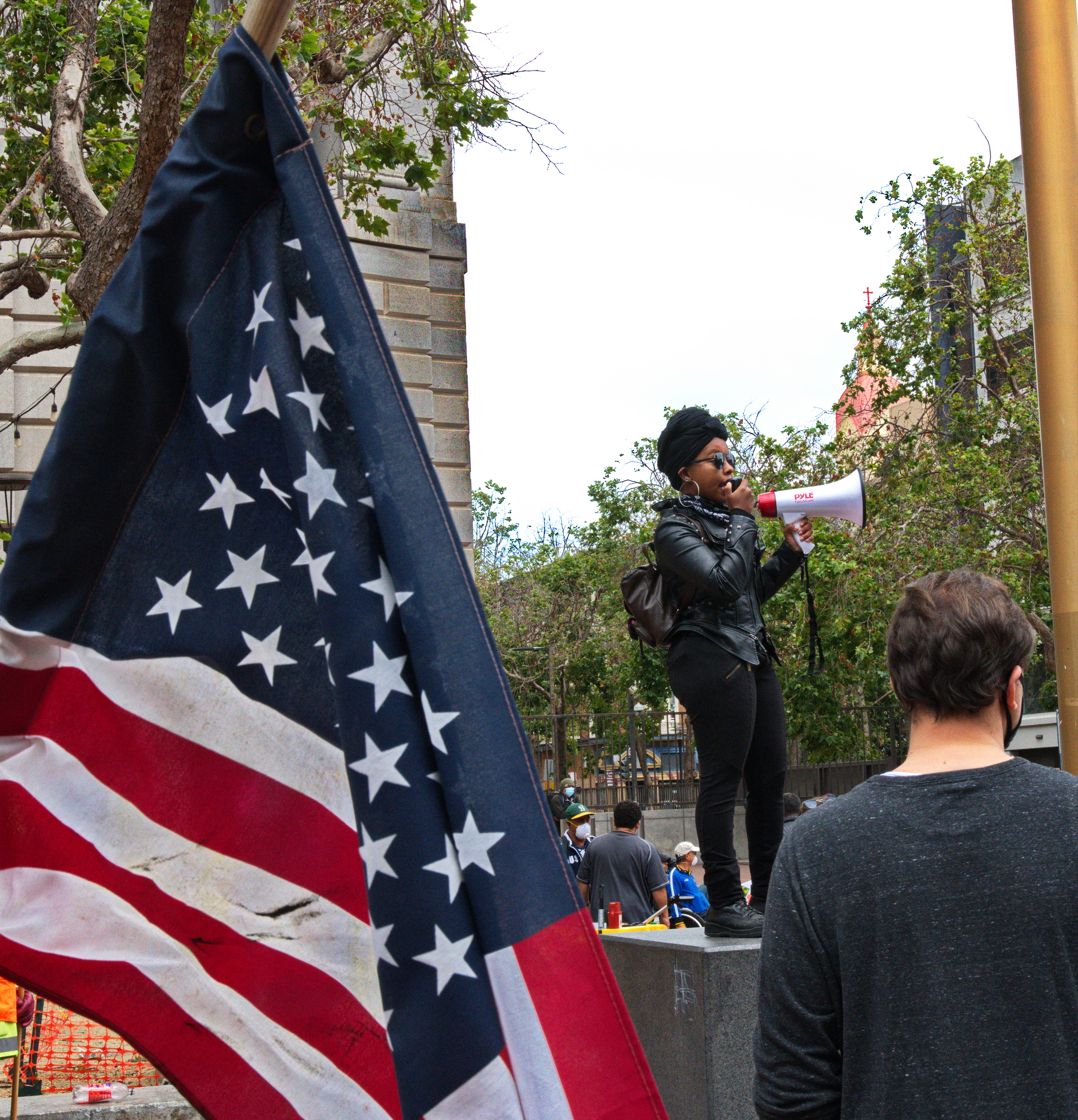 People began accumulating at United Nations Plaza, next to Market Street before noon on Saturday. The rally started as protesters addressed the growing crowd.They then marched the short distance to the steps of City Hall where activists continued to speak. There was no music or entertainment. The mood was anger mixed with sorrow as black and white people spoke of the very difference worlds they inhabited.